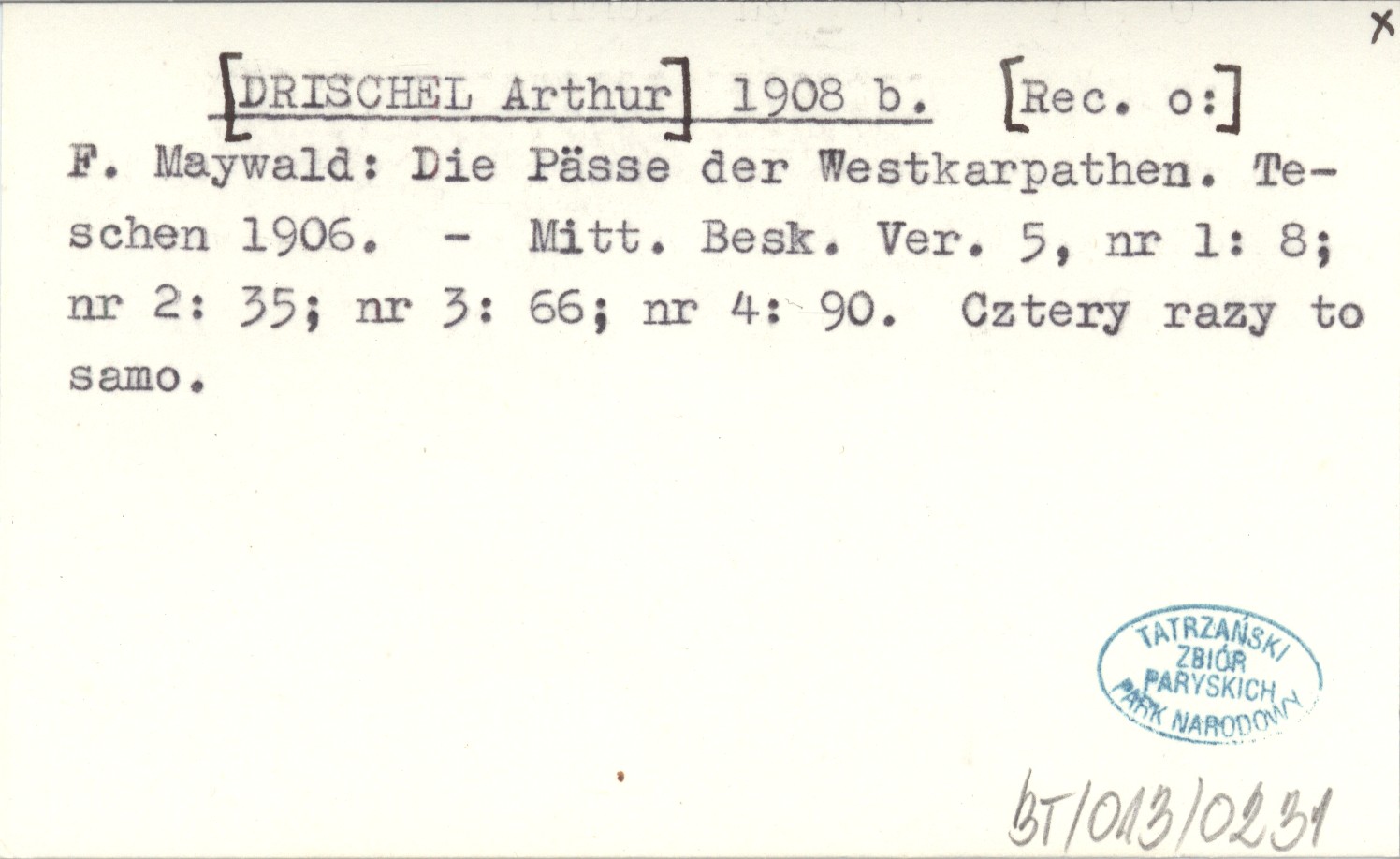 [DRISCHEL Arthur] 1908 b [Rec. o:] F. Maywald: Die Pässe der Westkarpathen. Teschen 1906.