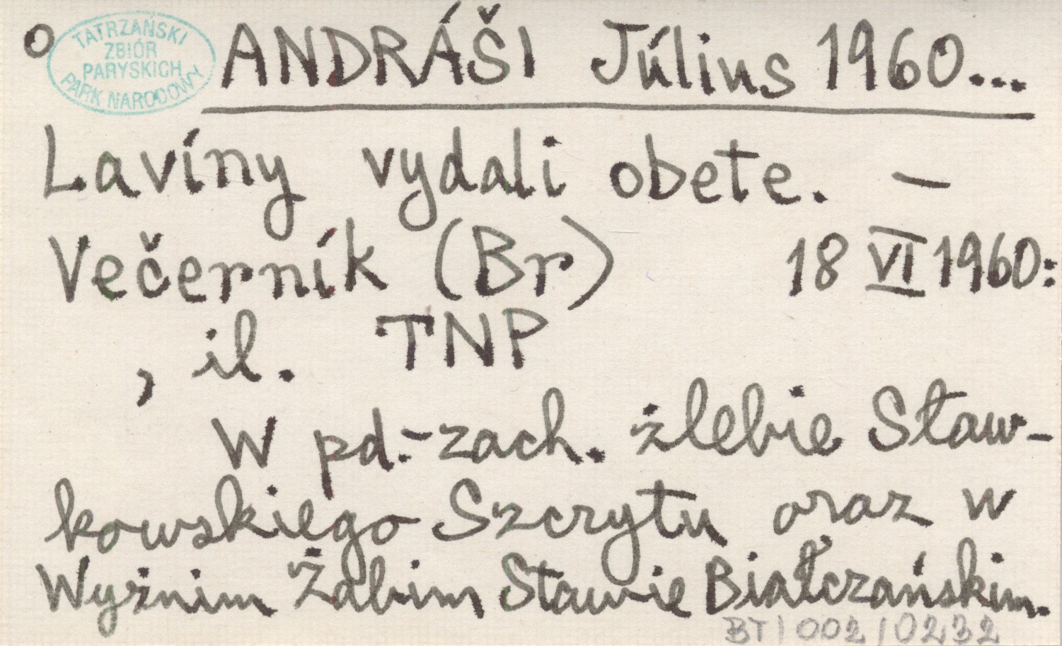 Večerník ((Br)) , 18 VI 1960, il. W pd.-zach. żlebie Sławkowskiego Szczytu oraz w Wyżnim Żabim Stawie Białczańskim.