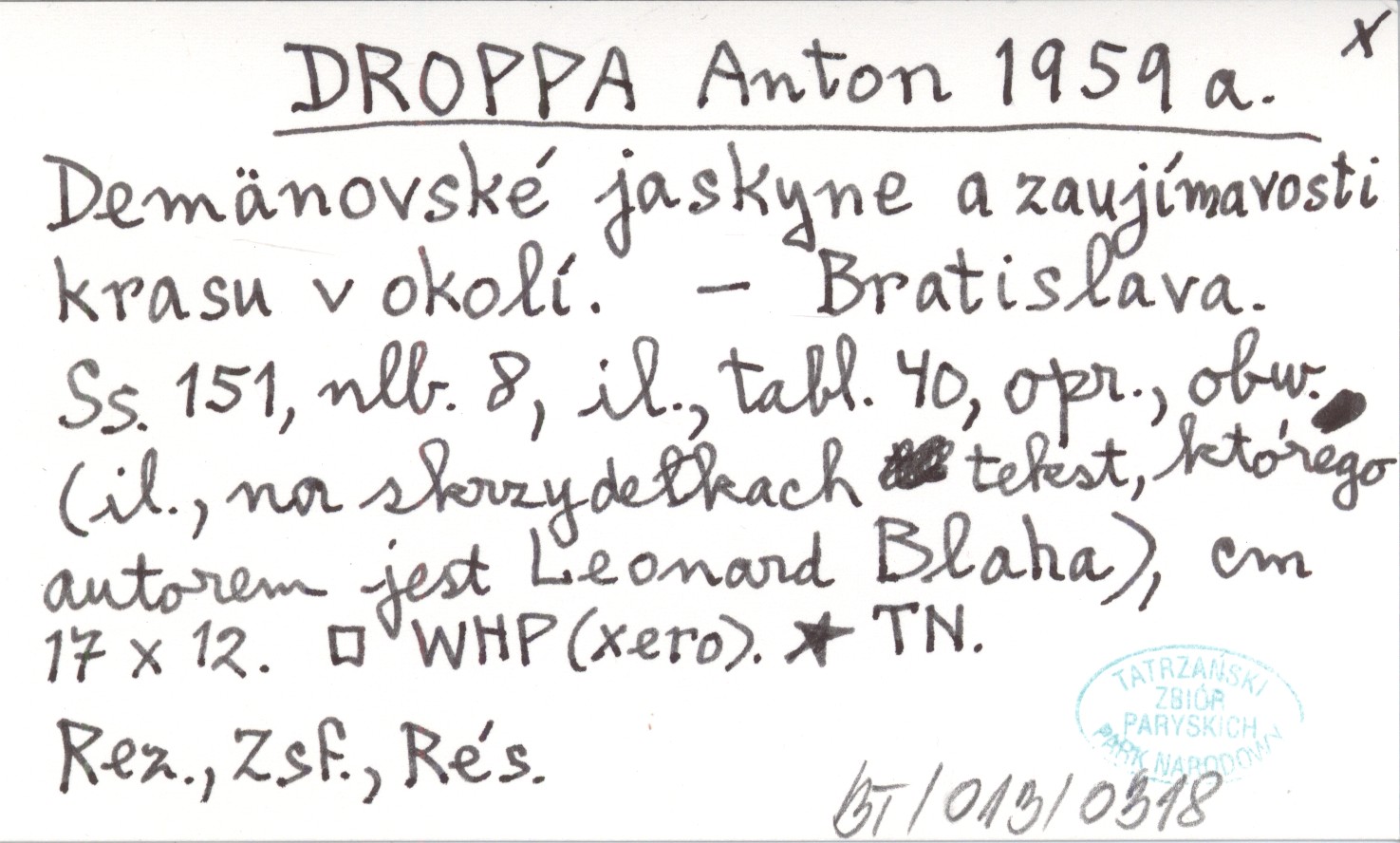 DROPPA Anton 1959 a Demänovské jaskyne a zaujímavosti krasu v okolí.