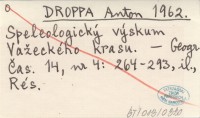 DROPPA Anton 1962 Speleologický výskum Vaľeckého krasu.