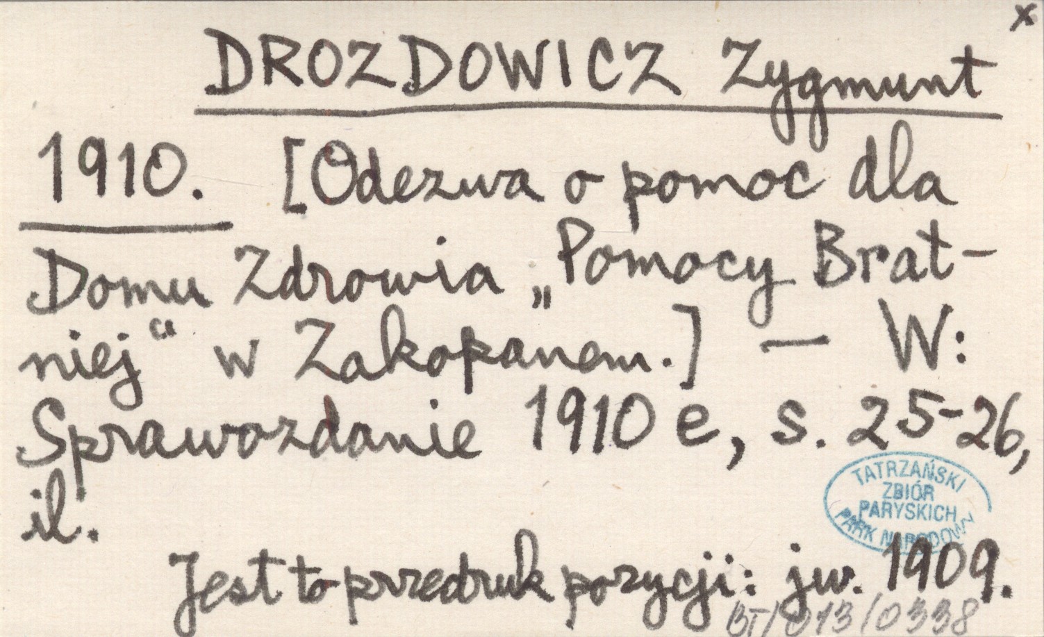 DROZDOWICZ Zygmunt 1910 [Odezwa o pomoc dla Domu Zdrowia "Pomocy Bratniej" w Zakopanem.]