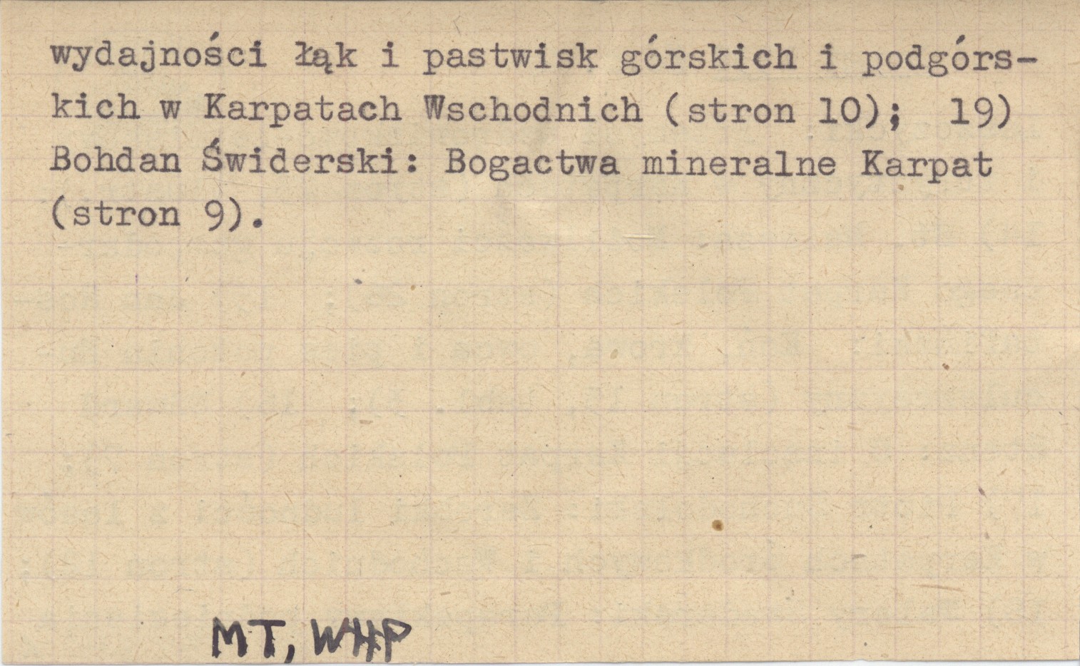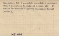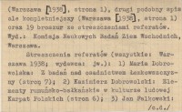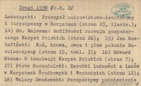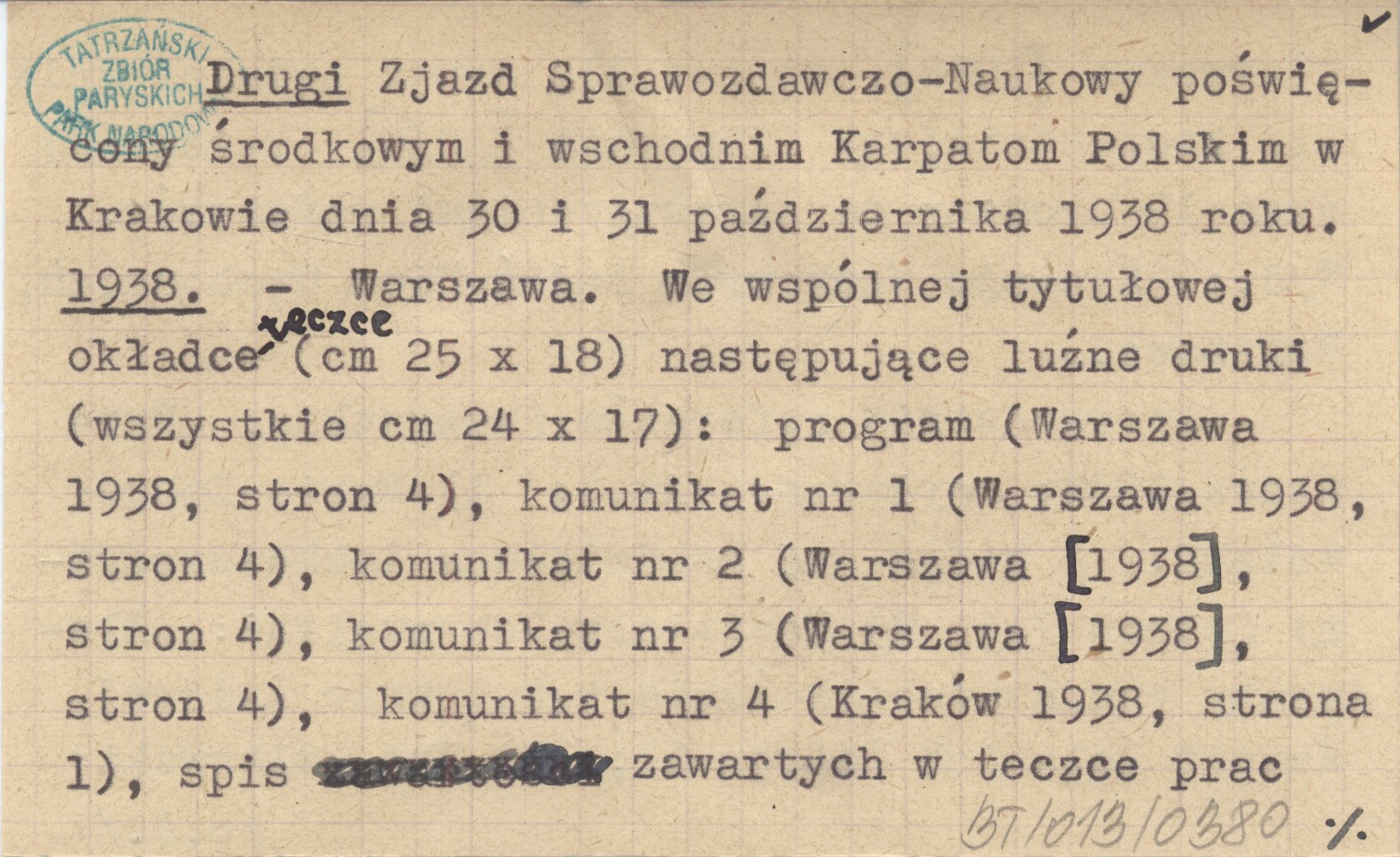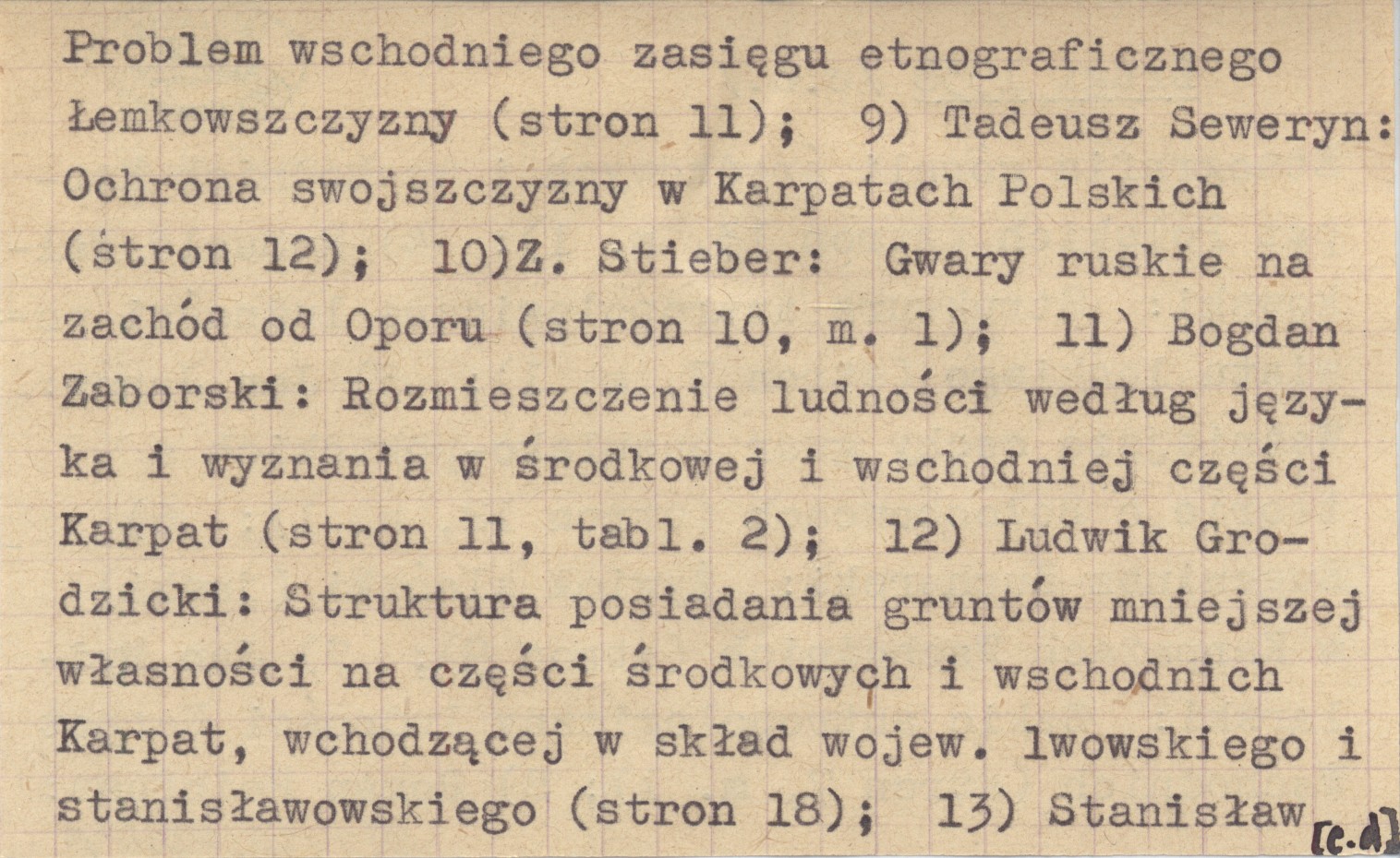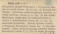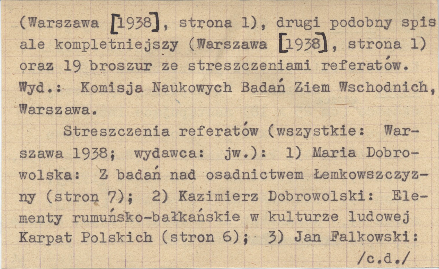 Komisja Naukowych Badań Ziem Wschodnich, Warszawa , 24x17 cm. We wspólnej tytułowej okładce-teczce (25x18 cm) następujące luźne druki (wszystkie 24x17 cm): program (Warszawa 1938, 4 s.), komunikat nr 1 (Warszawa 1938, 4 s.), komunikat nr 2 (Warszawa [1938], 4 s.), komunikat nr 3 (Warszawa [1938], 4 s.), komunikat nr 4 (Kraków 1938, 1 s.), spis zawartych w teczce prac (Warszawa [1938], 1 s.), drugi podobny spis ale kompletniejszy (Warszawa [1938], 1 s.) oraz 19 broszur ze streszczeniami referatów. Streszczenia referatów (wszystkie: Warszawa 1938 ; wydawca: jw.): 1) Maria Dobrowolska: Z badań nad osadnictwem Łemkowszczyzny (7 s.) ; 2) Kazimierz Dobrowolski: Elementy rumuńsko-bałkańskie w kulturze ludowej Karpat Polskich (6 s.) ; 3) Jan Falkowski: Etnografia górali środkowych i wschodnich Karpat Polskich (13 s., 1 mapa) ; 4) Romuald Falkowski: Struktura antropologiczna ludności powiatu leskiego (7 s., 1 mapa) ; 5) Jan Janów: Ważniejsze cechy gwar huculsko-pokuckich a teorie o Bołochowcach (12 s., 1 mapa) ; 6) Eugeniusz Kucharski: Szkic antropologiczny ludności Karpat Wschodnich (7 s., 1 mapa) ; 8) Roman Reinfuss: Problem wschodniego zasięgu etnograficznego Łemkowszczyzny (11 s.) ; 9) Tadeusz Seweryn: Ochrona swojszczyzny w Karpatach Polskich (12 s.) ; 10) Z. Stieber: Gwary ruskie na zachód od Oporu (10 s., 1 mapa) ; 11) Bogdan Zaborski: Rozmieszczenie ludności według języka i wyznania w środkowej i wschodniej części Karpat (11 s., 2 k.) ; 12) Ludwik Grodzicki: Struktura posiadania gruntów mniejszej własności na części środkowych i wschodnich Karpat, wchodzącej w skład wojew. lwowskiego i stanisławowskiego (18 s.) ; 13) Stanisław Leszczycki: Przemysł uzdrowiskowo-letniskowy i turystyczny w Karpatach (23 s., il.) ; 14) St. Malessa: Możliwości rozwoju gospodarczego Karpat Polskich (26 s.) ; 15) Jan Rostafiński: Koń, krowa, owca i pies połonin Huculszczyzny (15 s., 3 k.) ; 16) Edward Stenz: O insolacji Karpat Polskich (7 s.) ; 17) Piotr Suchodolski: Zarobki ludności z lasów w Karpatach Środkowych i Wschodnich (12 s.) ; 18) Walery Swederski: Perspektywy podniesienia wydajności łąk i pastwisk górskich i podgórskich w Karpatach Wschodnich (10 s.) ; 19) Bohdan Świderski: Bogactwa mineralne Karpat (9 s.).