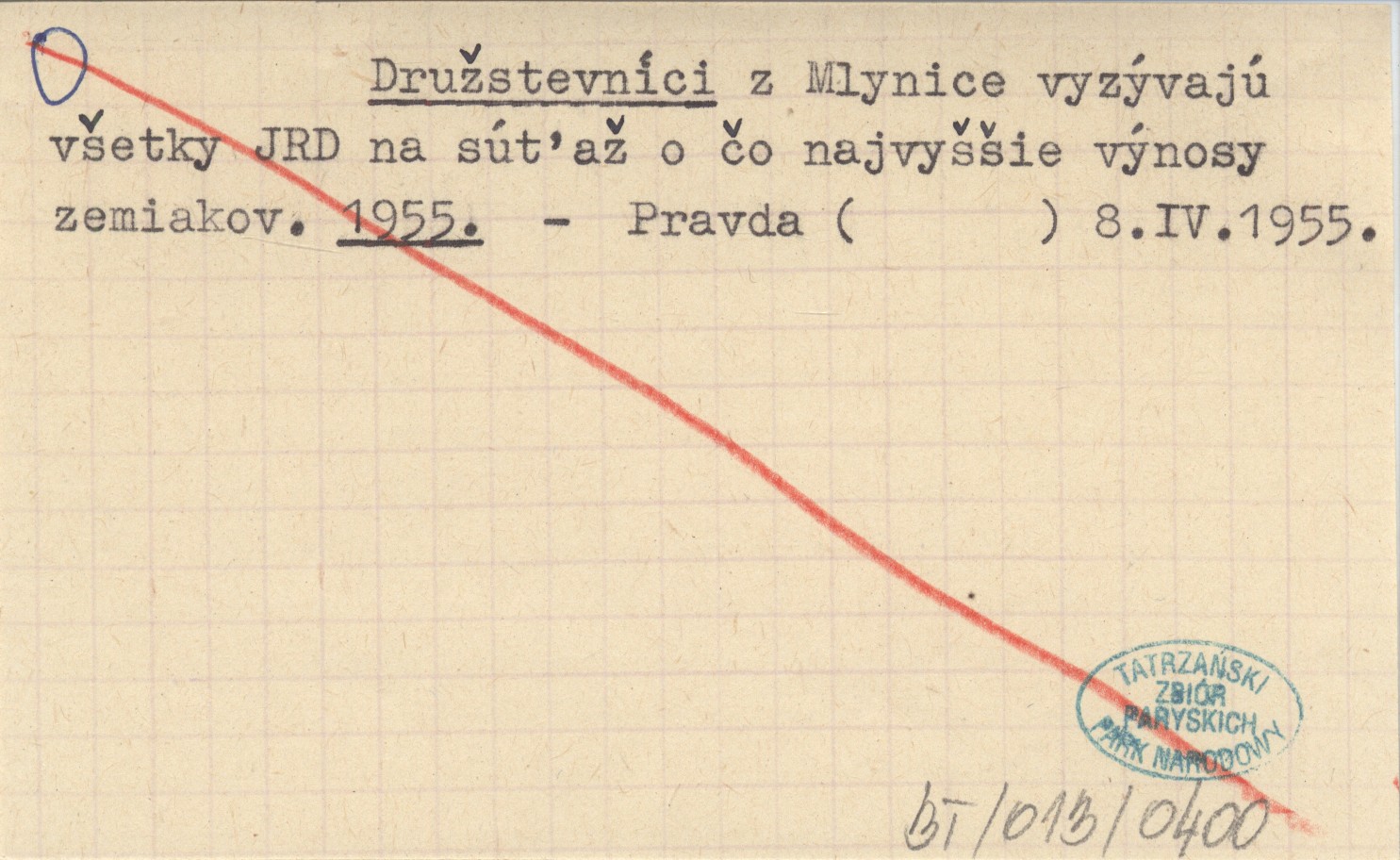 Dru¾stevnķci Z Mlynice vyzżvajś v¹etky JRD na sś»a¾ o čo najvy¹¹ie vżnosy zemiakov. 1955