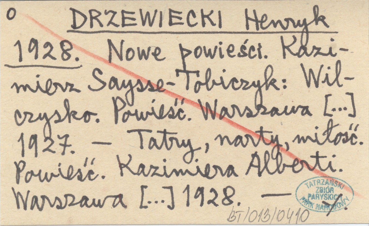 DRZEWIECKI Henryk 1928 Nowe powieści. Kazimierz Saysse-Tobiczyk: Wilczysko. Powieść. Warszawa [...] 1927. Tatry, narty, miłość. Powieść. Kazimiera Alberti. Warszawa [...] 1928.