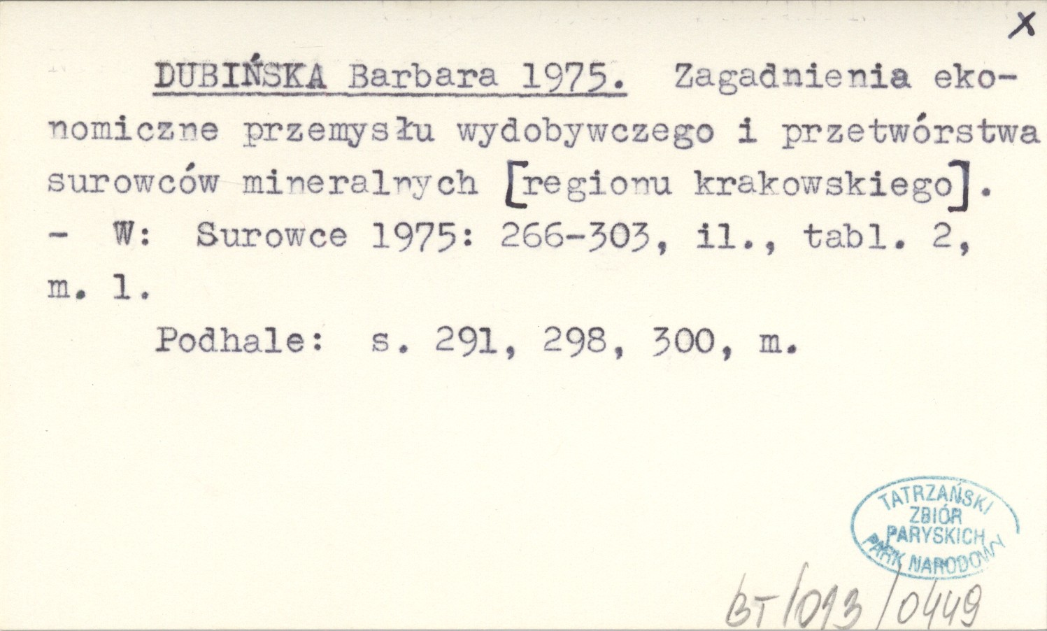 DUBIŃSKA Barbara 1975 Zagadnienia ekonomiczne przemysłu wydobywczego i przetwórstwa surowców mineralnych [regionu krakowskiego].
