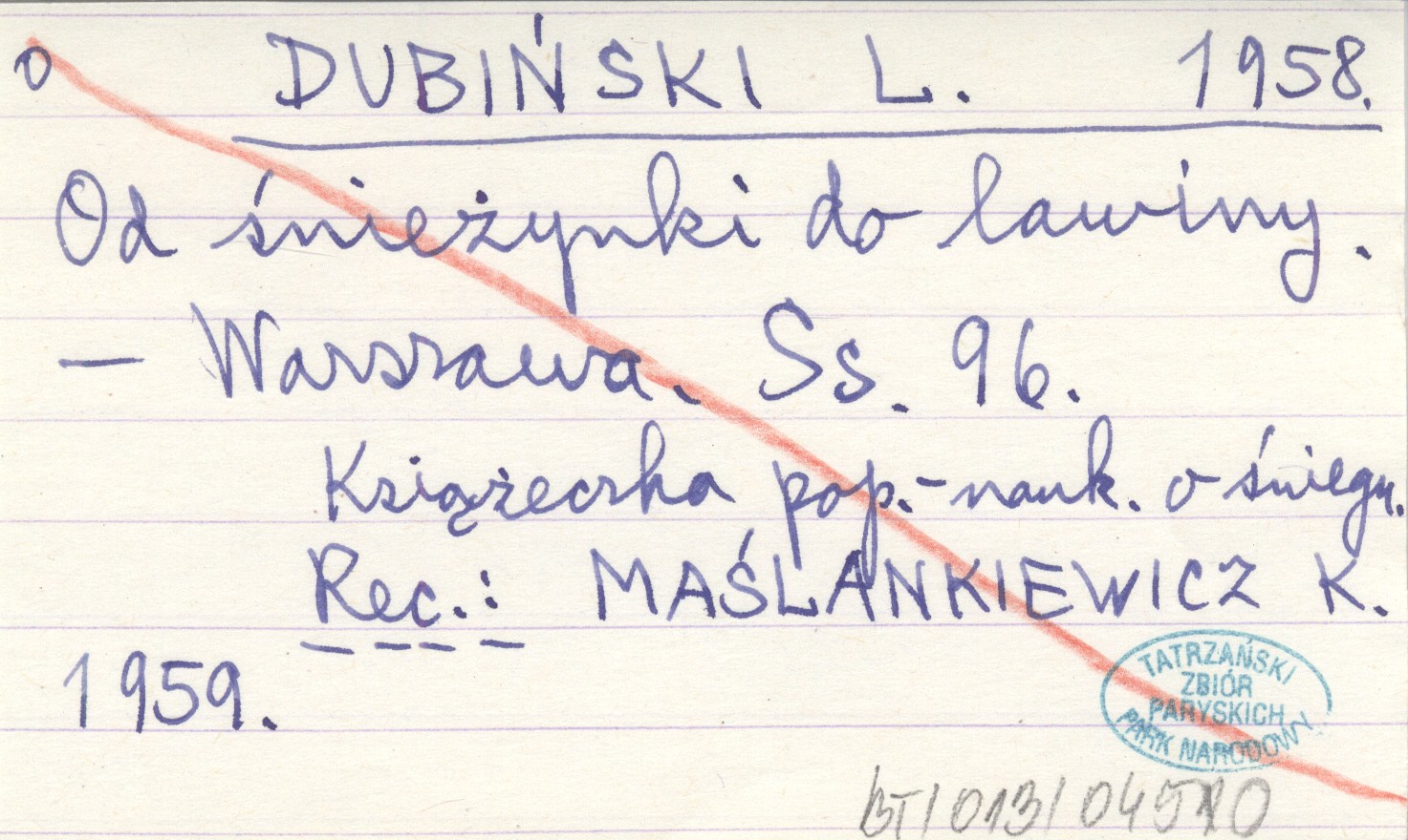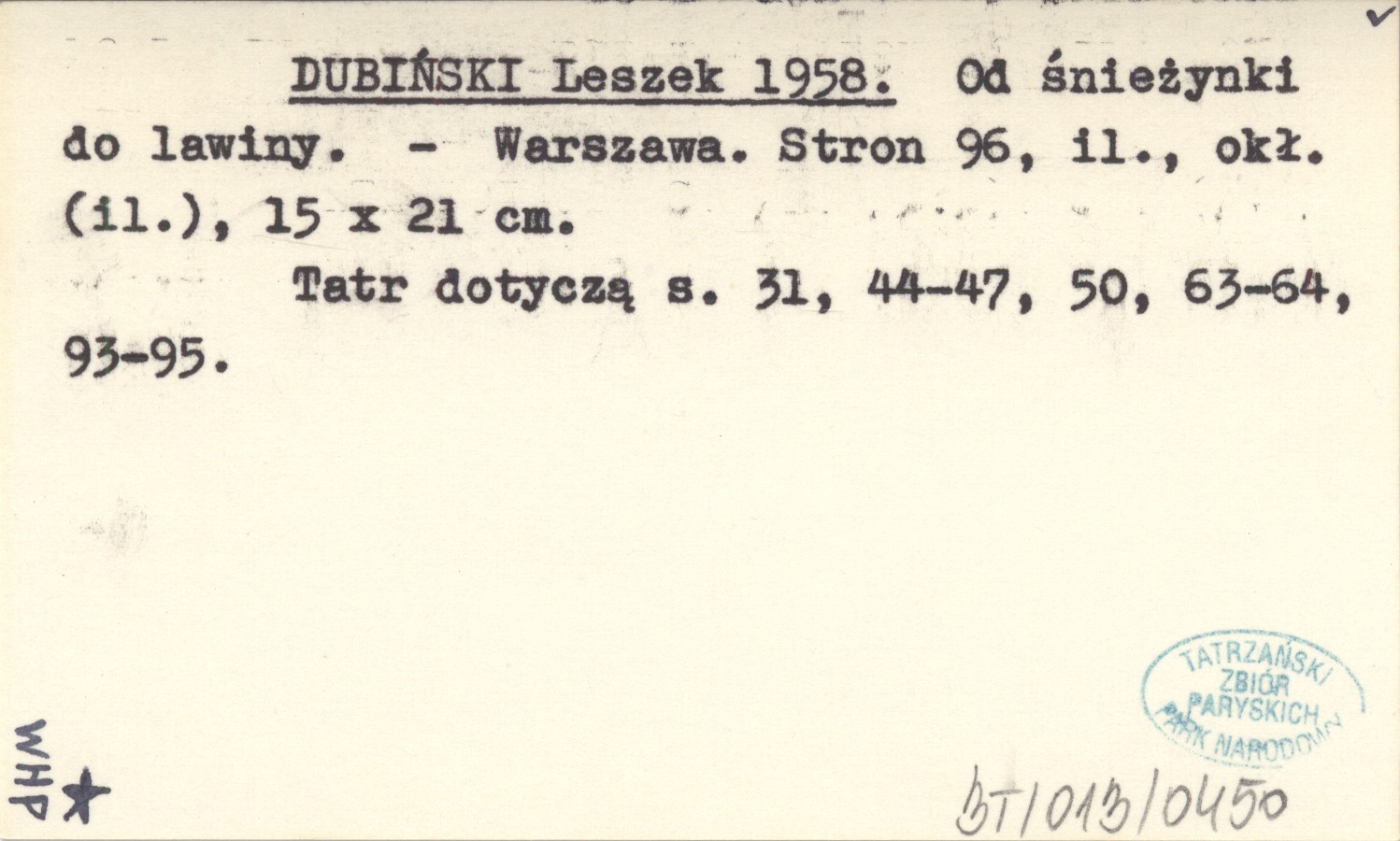 Warszawa , 96 s., il., okł. (il.), 15x21 cm. Książeczka pop.-nauk. o śniegu. Tatr dotyczą s. 31, 44-47, 50, 63-64, 93-95. REC: MAŚLANKIEWICZ K. 1959.