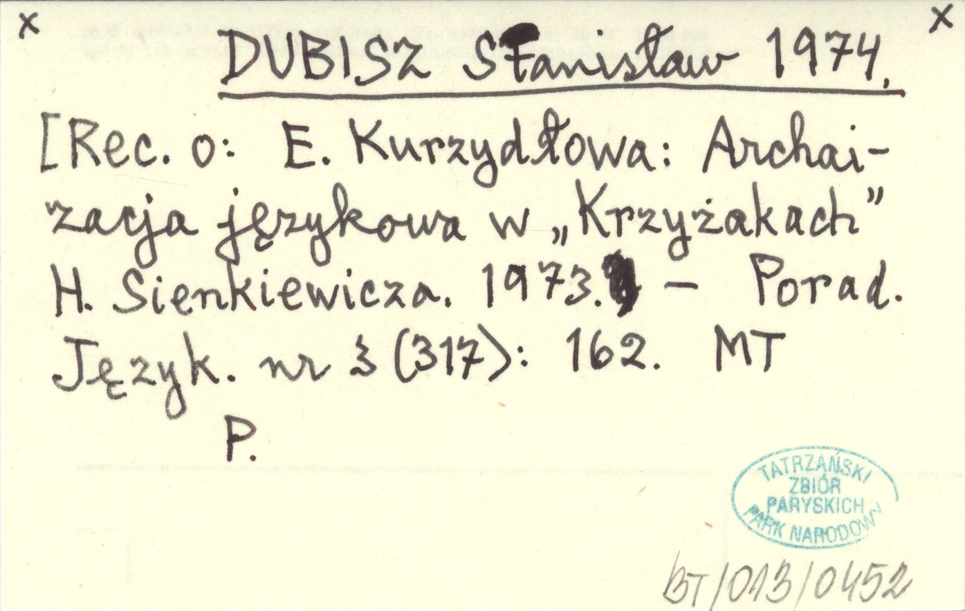 DUBISZ Stanisław 1974 [Rec. o: E. Kurzydłowa: Archaizacja językowa w "Krzyżakach" H. Sienkiewicza. 1973.