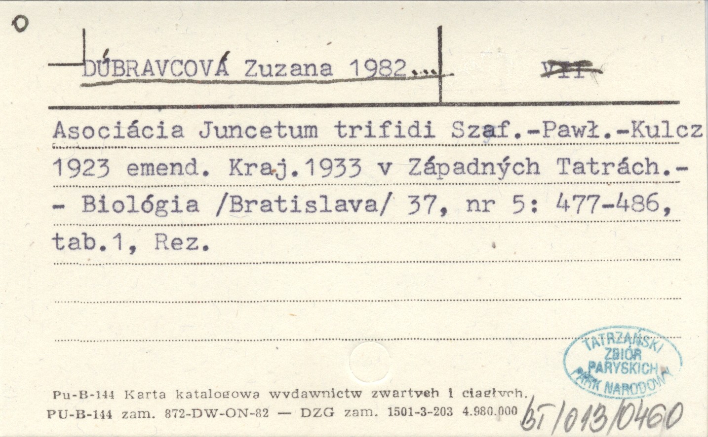 DÚBROVCOVÁ Zuzana 1982... Asociácia Juncetum trifidi Szaf.-Pawł.-Kulcz 1923 emend. Kraj. 1933 v Západných Tatrách.