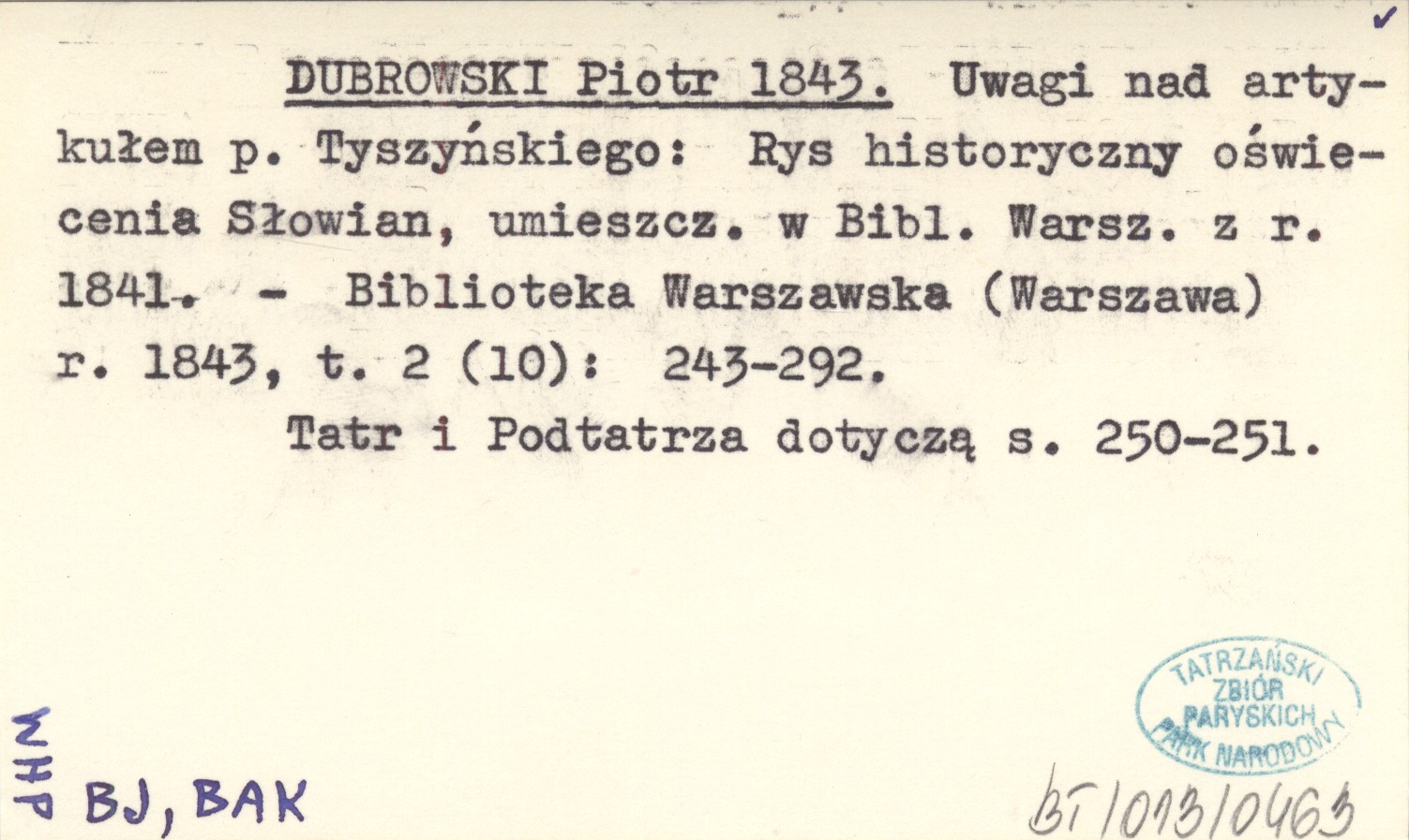 DUBROWSKI Piotr 1843 Uwagi nad artykułem p. Tyszyńskiego: Rys historyczny oświecenia Słowian, umieszcz. w Bibl. Warsz. z r. 1841.