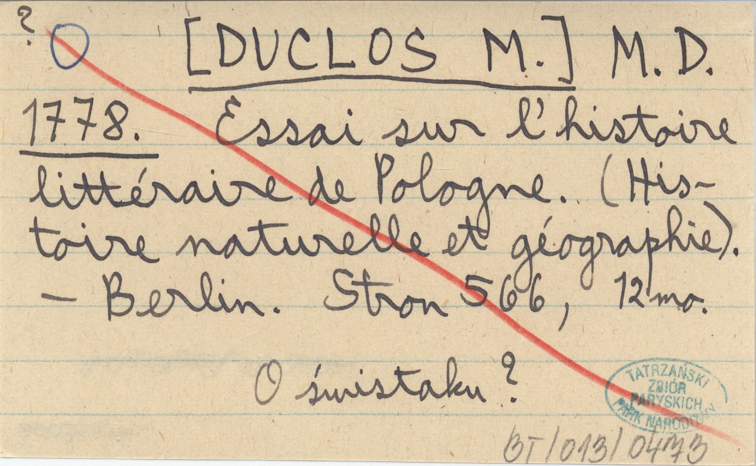 M. D. [DUCLOS M.] 1778 Essai sur l'histoire littéraire de Pologne. (Histoire naturelle et géographie).