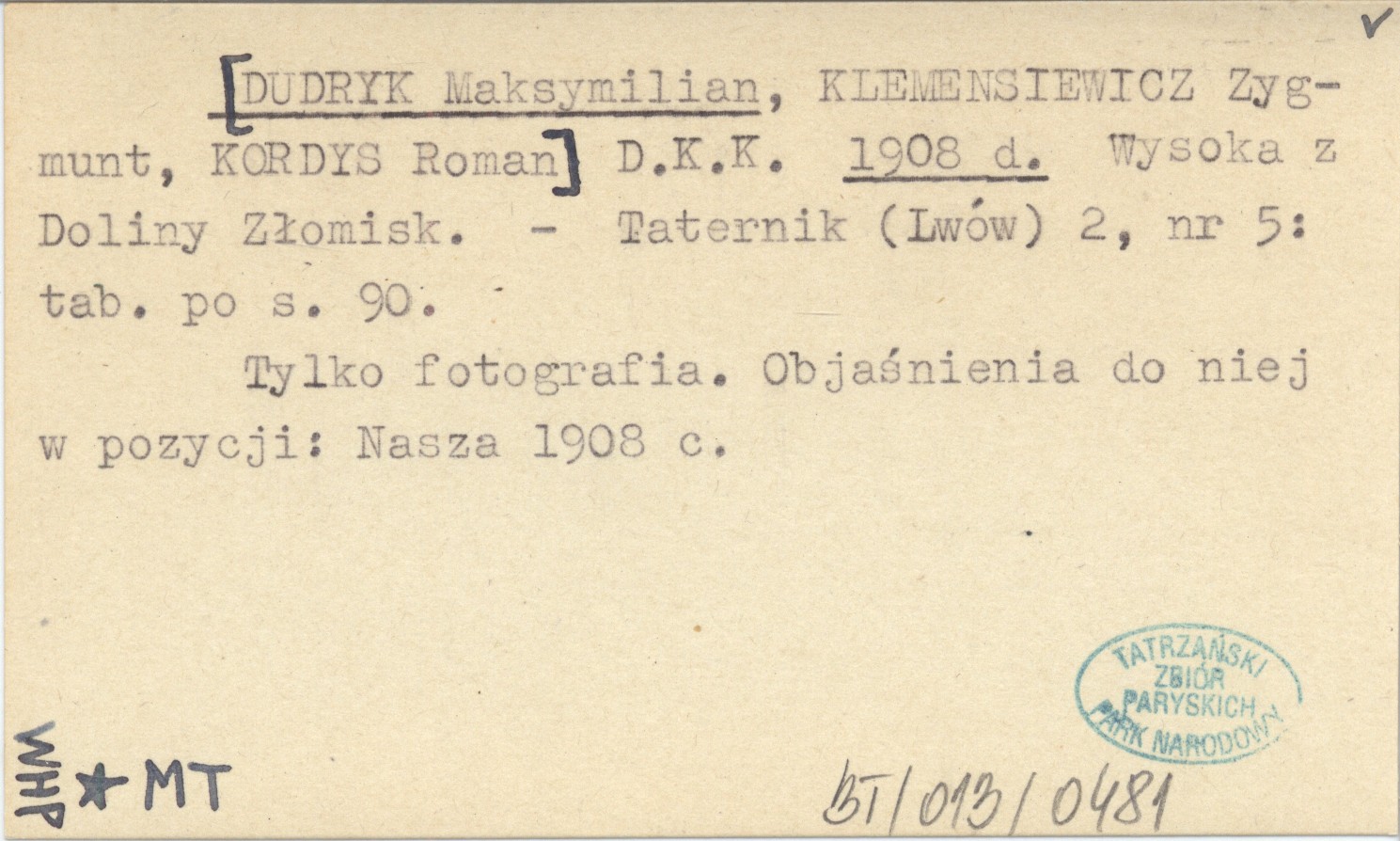 D. K. K. [DUDRYK Maksymilian] KLEMENSIEWICZ, Zygmunt. ; KORDYS, Roman. ; 1908 d Wysoka z Doliny Złomisk.