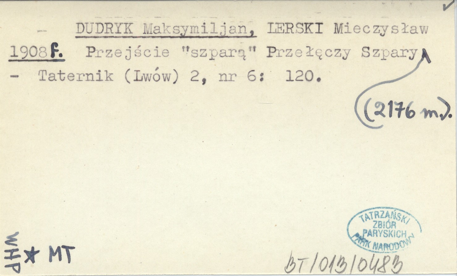 DUDRYK Maksymilian LERSKI, Mieczysław. ; 1908 f Przejście "szparą" Przełęczy Szpary (2176 m).