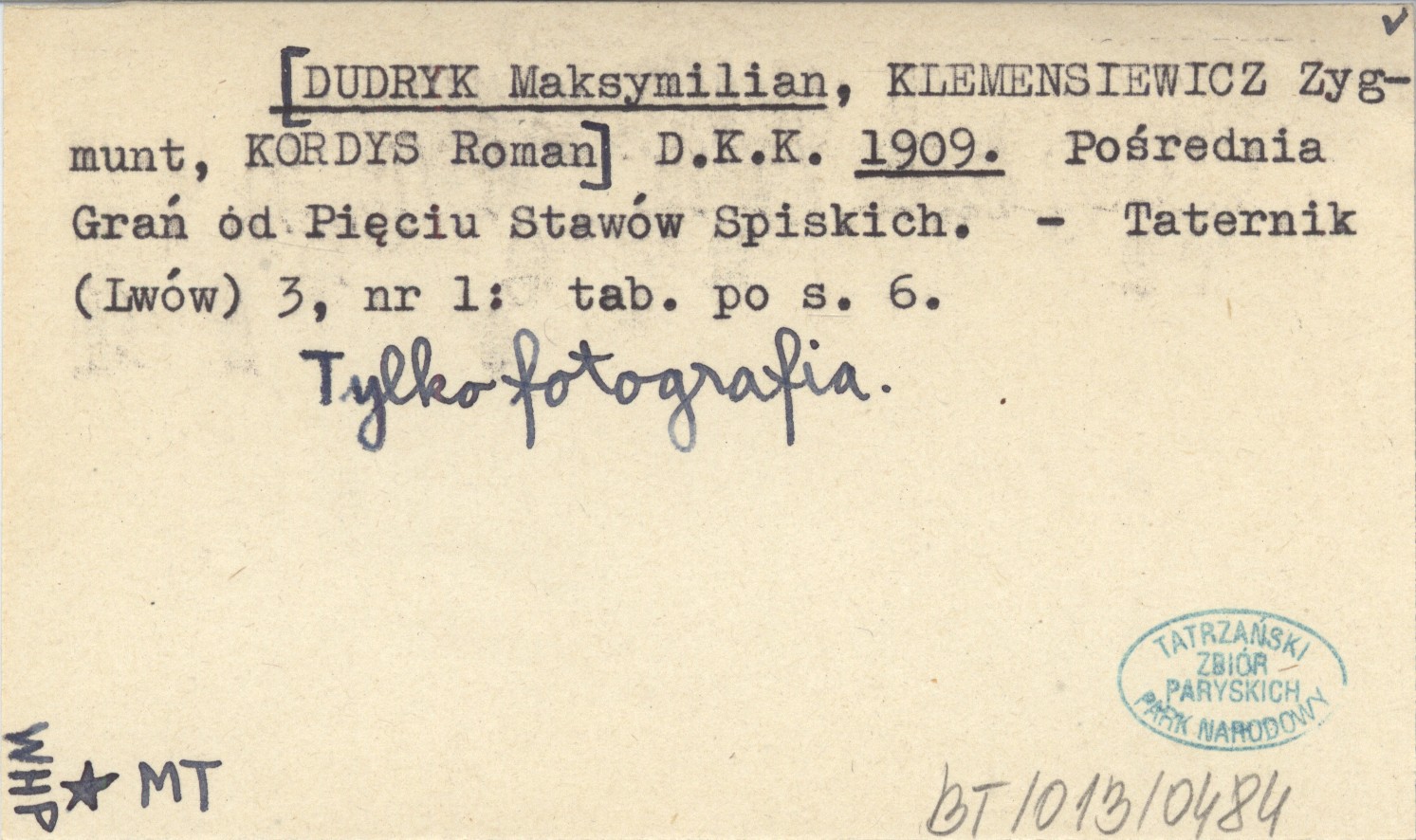 D. K. K. [DUDRYK Maksymilian] KLEMENSIEWICZ, Zygmunt. ; KORDYS, Roman. ; 1909 Pośrednia Grań od Pięciu Stawów Spiskich.