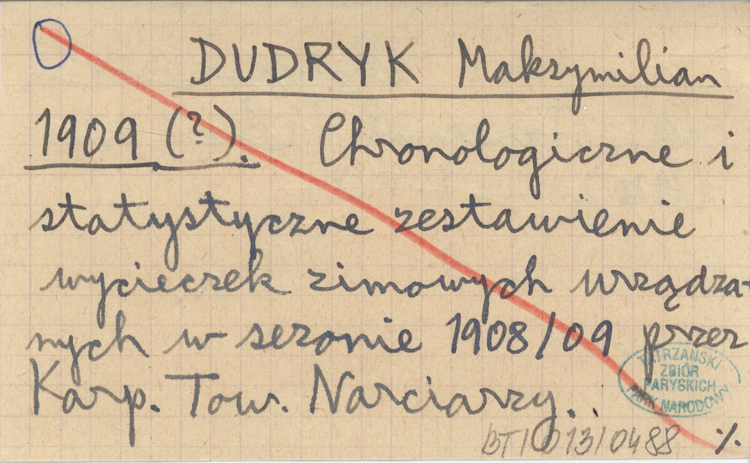 DUDRYK Maksymilian 1909 (?) Chronologiczne i statystyczne zestawienie wycieczek zimowych urządzanych w sezonie 1908/09 przez Karp. Tow. Narciarzy.