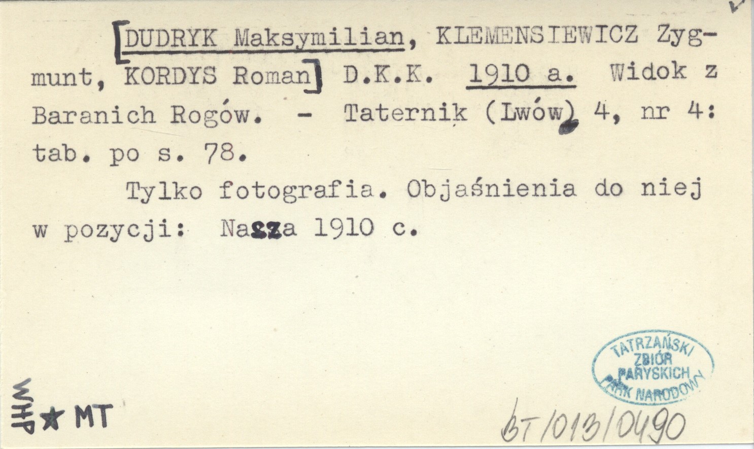 D. K. K. [DUDRYK Maksymilian] KLEMENSIEWICZ, Zygmunt. ; KORDYS, Roman. ; 1910 a Widok z Baranich Rogów.