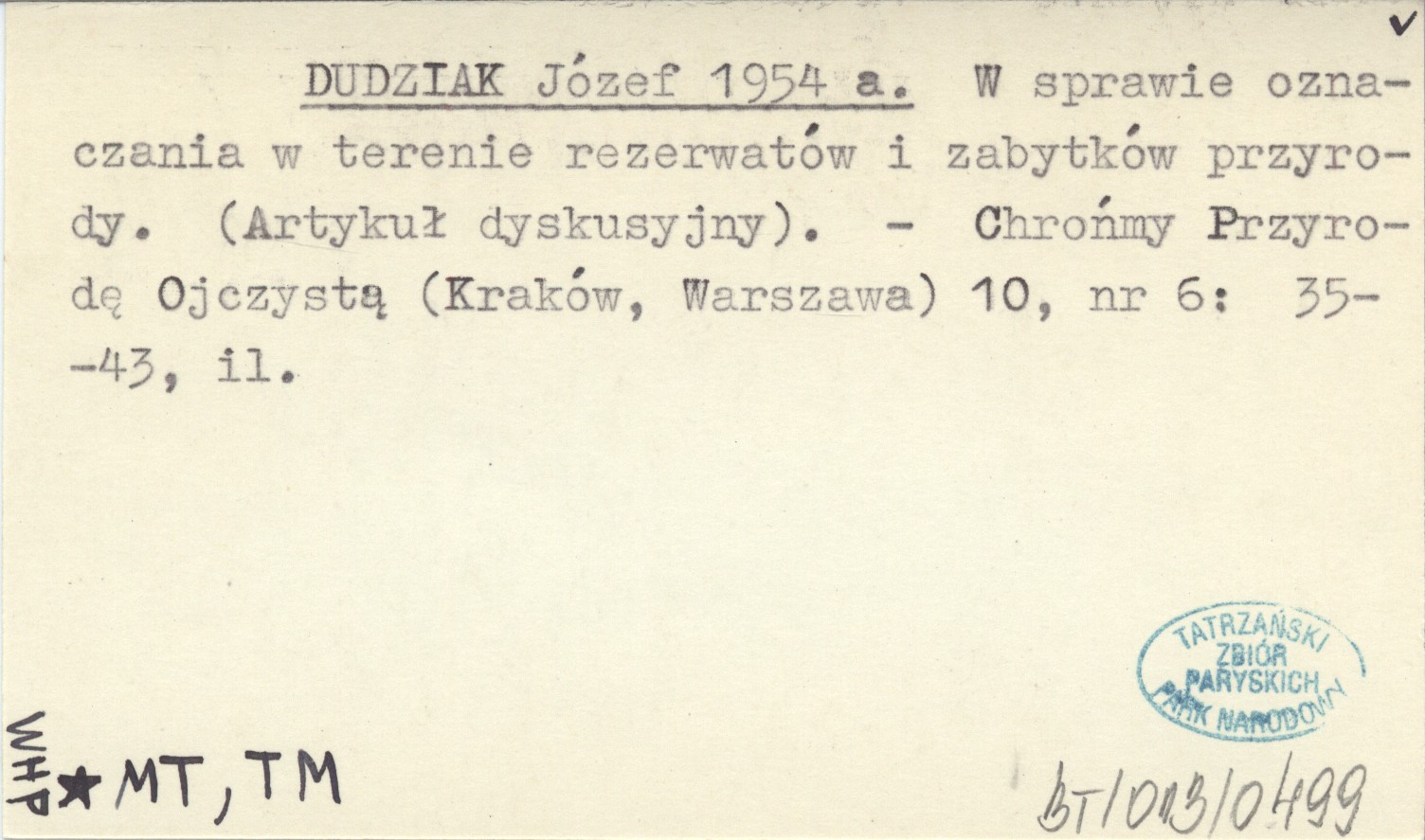 DUDZIAK Józef 1954 a W sprawie oznaczania w terenie rezerwatów i zabytków przyrody. (Artykuł dyskusyjny).