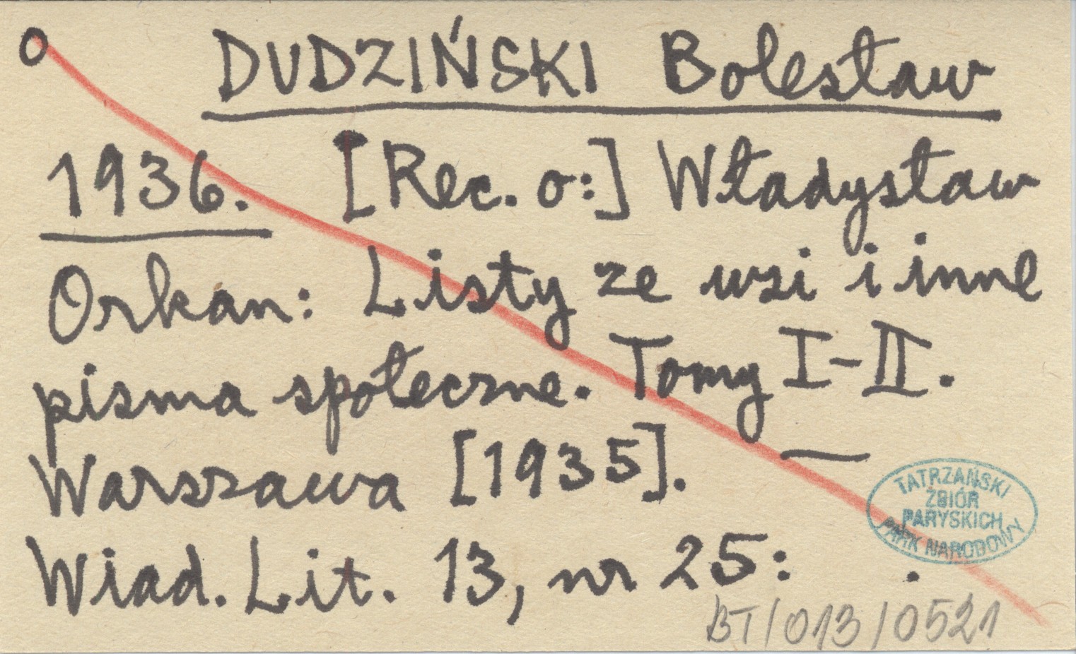 DUDZIŃSKI Bolesław 1936 [Rec. o:] Władysław Orkan: Listy ze wsi i inne pisma społeczne. Tomy I-II. Warszawa [1935].