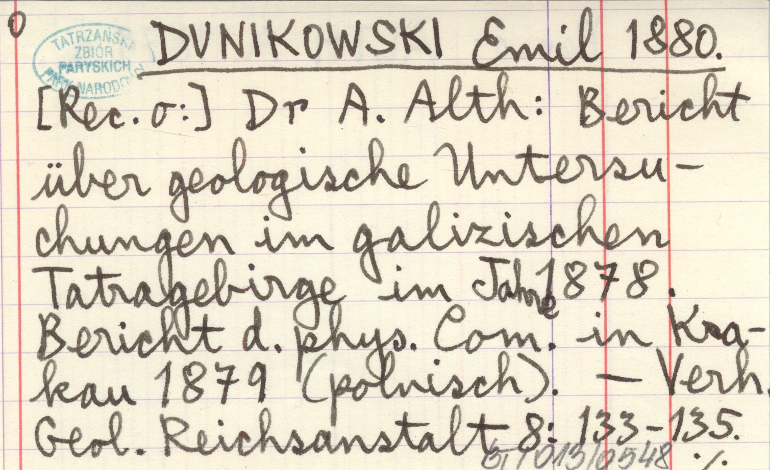 DUNIKOWSKI Emil 1880 [Rec. o:] Dr A. Alth: Bericht über geologische Untersuchungen im galizischen Tatragebirge im Jahre 1878. Bericht d. phys. Com. in Krakau 1879 (polnisch).