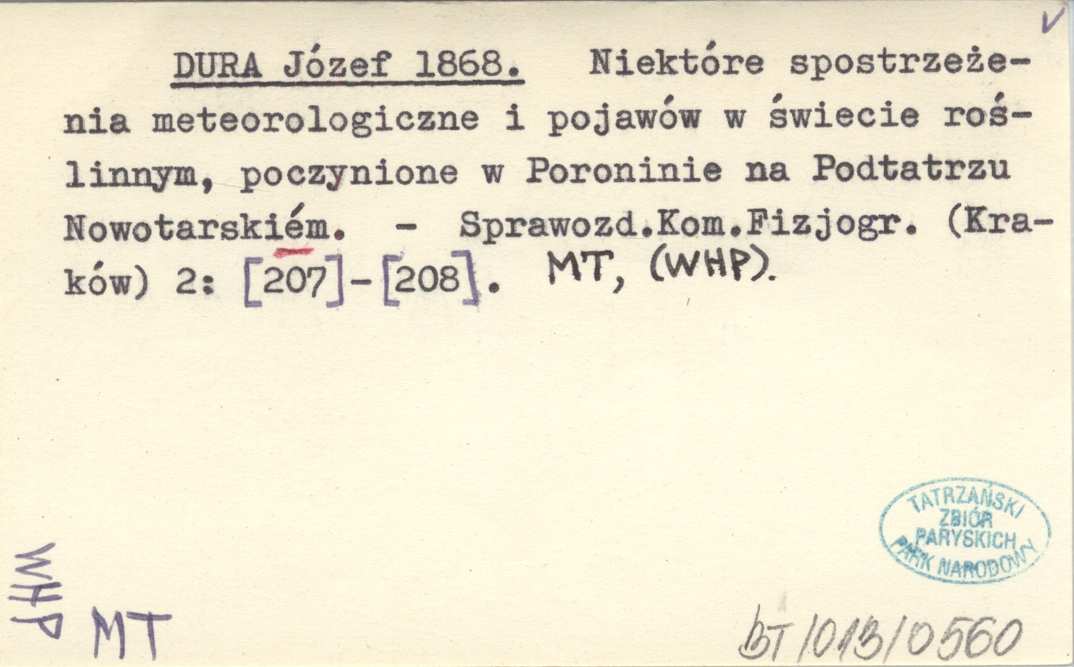 DURA Józef 1868 Niektóre spostrzeżenia meteorologiczne i pojawów w świecie roślinnym, poczynione w Poroninie na Podtatrzu Nowotarskiém.