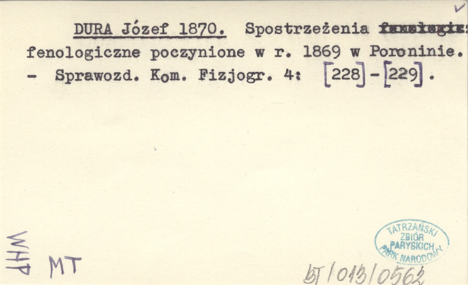 DURA Józef 1870 Spostrzeżenia fenologiczne poczynione w r. 1869 w Poroninie.