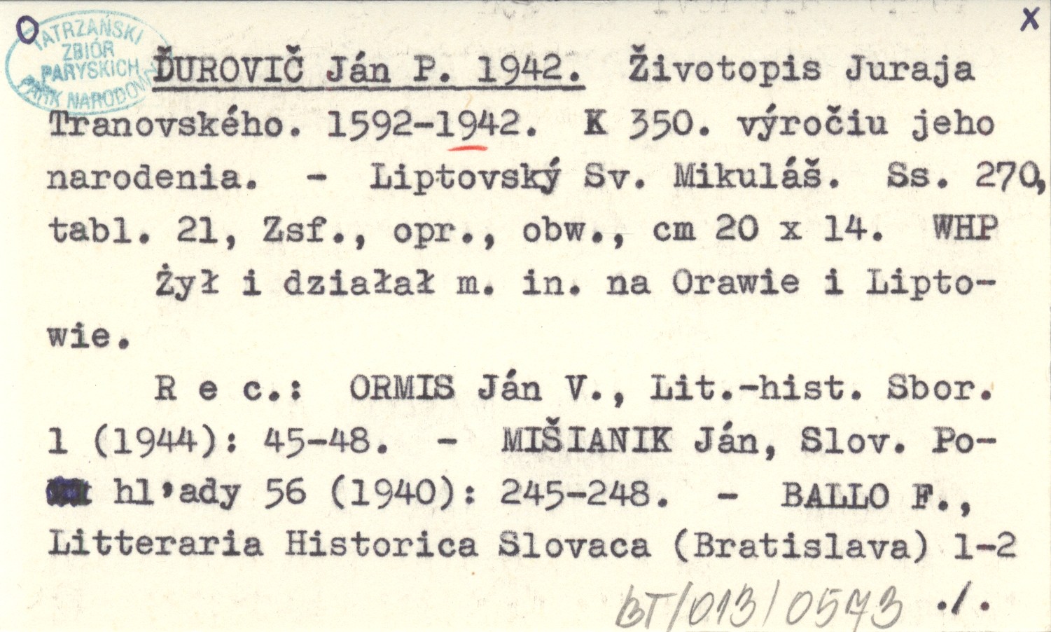 ĎUROVIČ Ján P. 1942 Životopis Juraja Tranovského. 1592-1942. K 350. výročiu jeho narodenia.