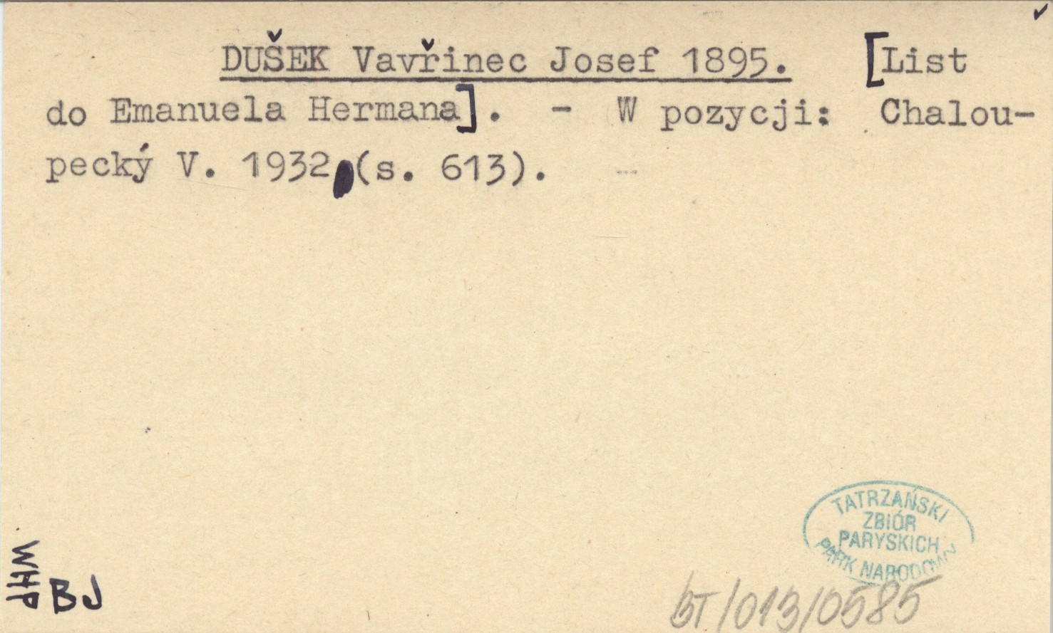 DUŠEK Vavřinec Josef 1895 [List do Emanuela Hermana.]