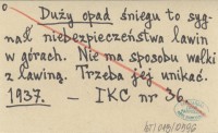 Duży opad śniegu to sygnał niebezpieczeństwa lawin w górach. Nie ma sposobu walki z lawiną. Trzeba jej unikać. 1937