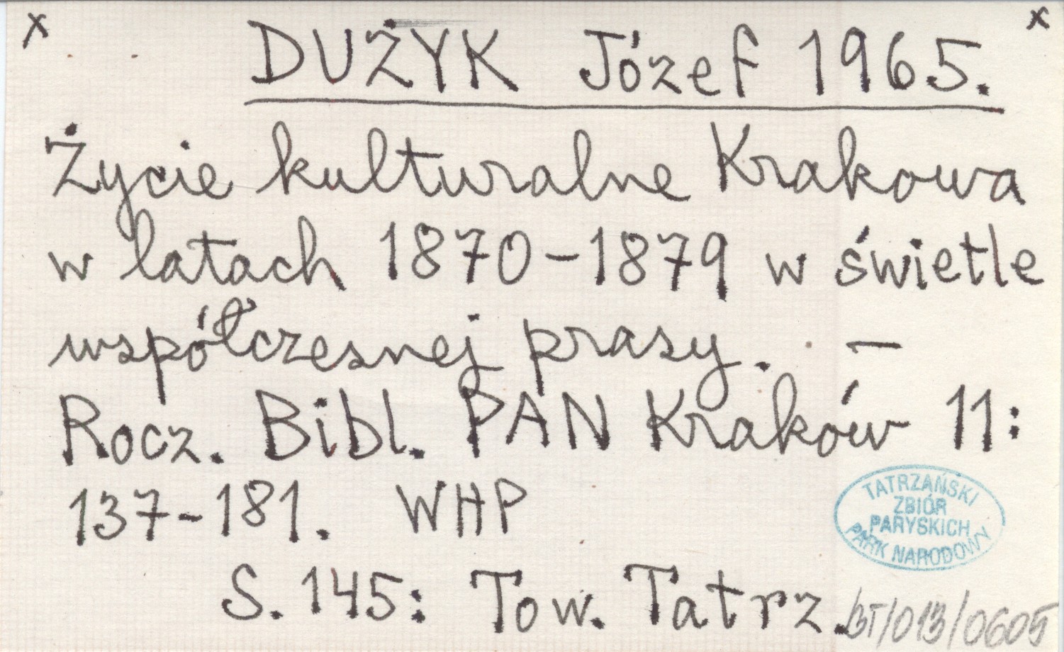 DUŻYK Józef 1965 Życie kulturalne Krakowa w latach 1870-1879 w świetle współczesnej prasy.