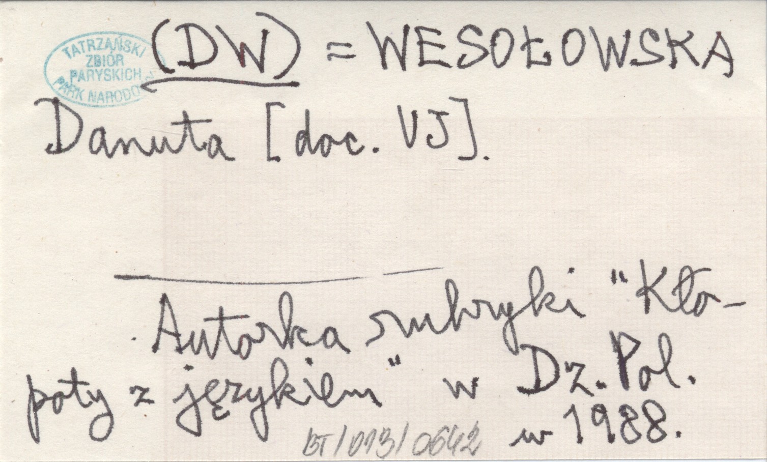 (DW) WESOŁOWSKA Danuta [doc. UJ] Autorka rubryki "Kłopoty z językiem" w Dzienniku Polskim w 1988.