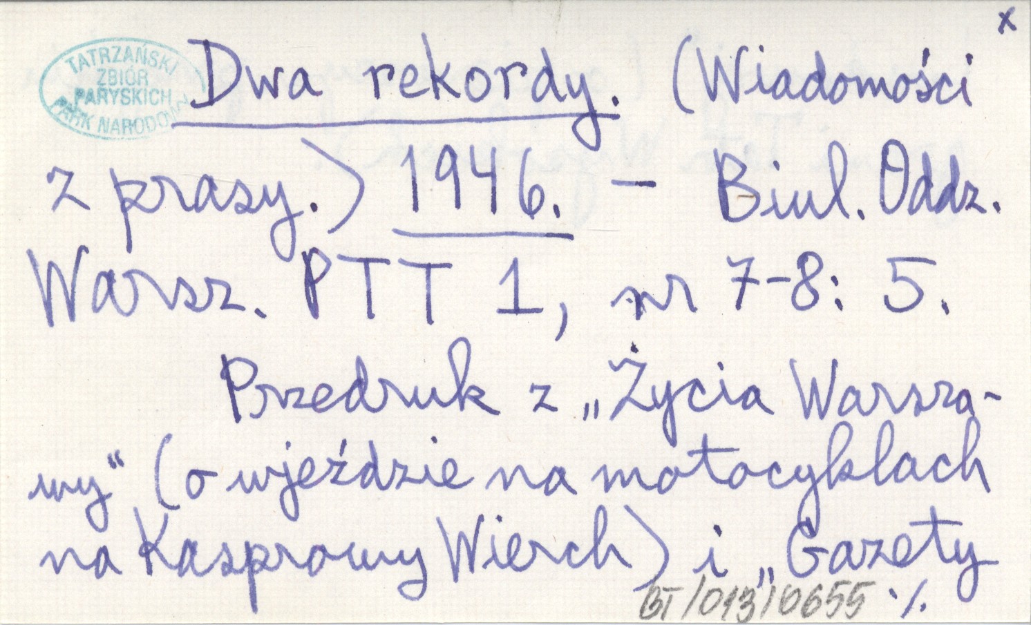 Biuletyn Oddziału Warszawskiego PTT, 1, nr 7-8: 5. Przedruk z "Życia Warszawy" (o wjeździe na motocyklach na Kasprowy Wierch) i "Gazety Ludowej" (o pierwszym przejściu grani Tatr Wysokich).