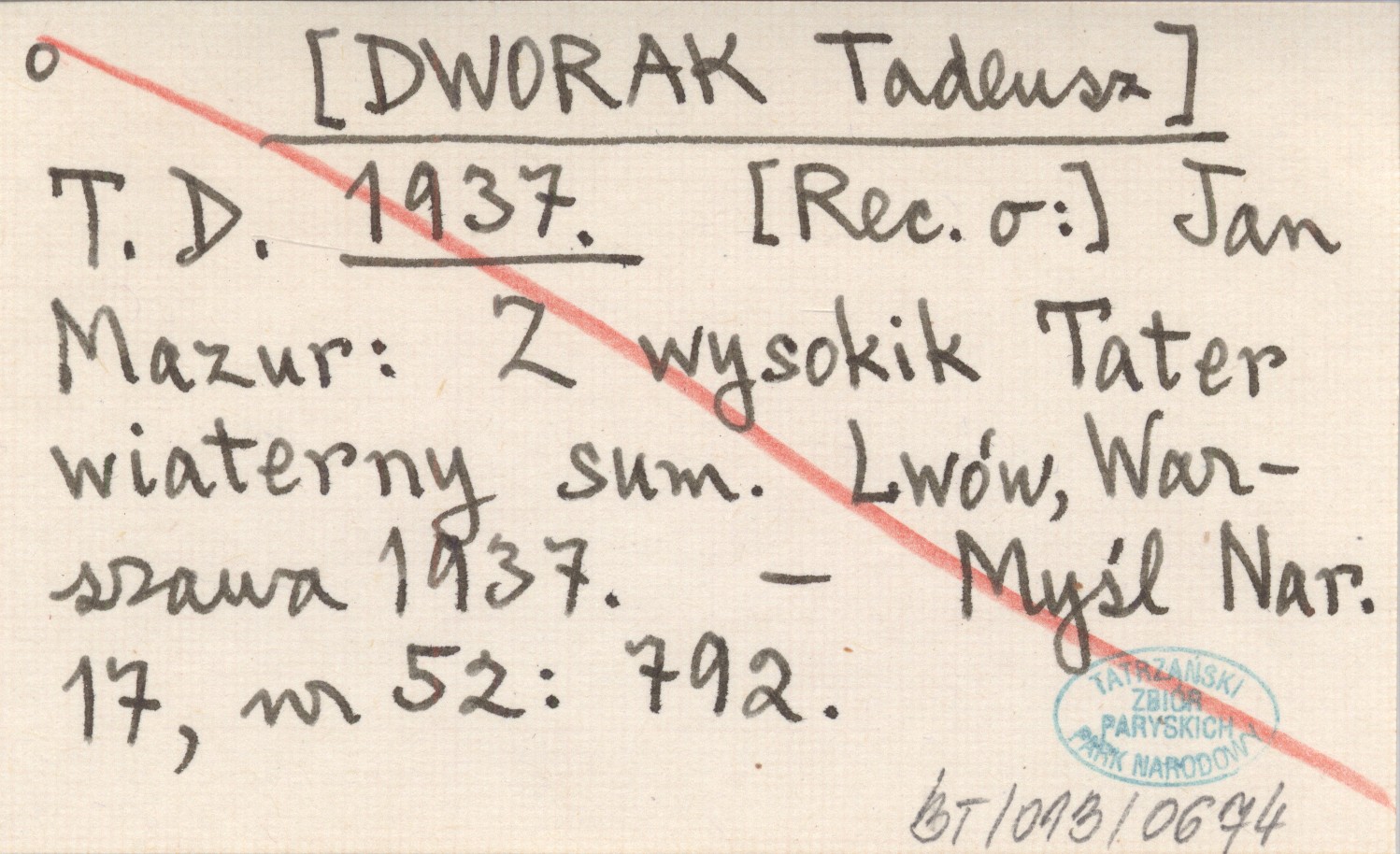 T. D. [DWORAK Tadeusz] 1937 [Rec. o:] Jan Mazur: Z wysokik Tater wiaterny sum. Lwów, Warszawa 1937.