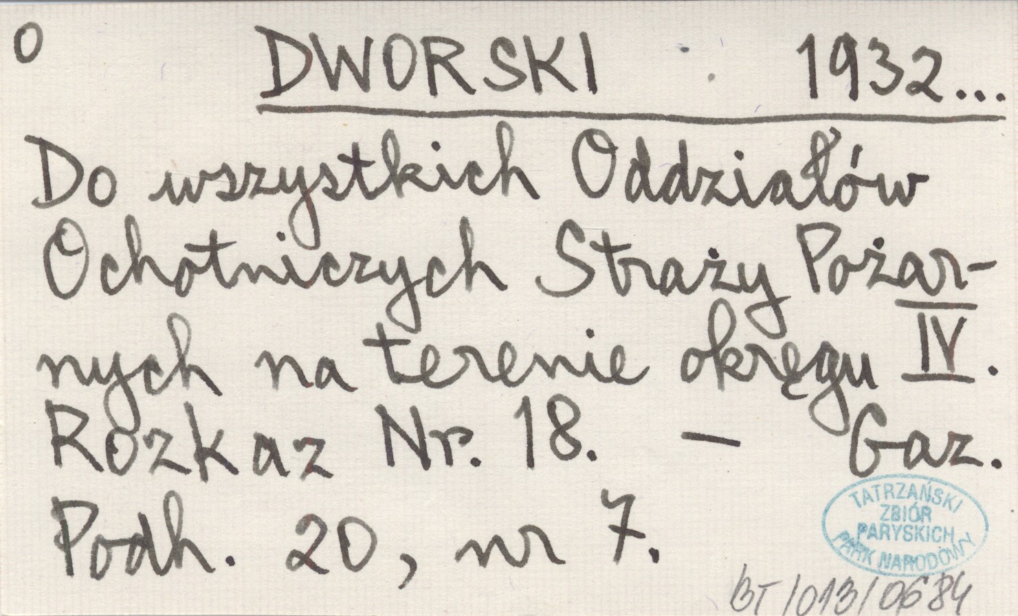 DWORSKI 1932... Do wszystkich Oddziałów Ochotniczych Straży Pożarnych na terenie okręgu IV. Rozkaz Nr. 18.