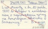 DWORSKI Tadeusz [1881?] List otwarty z dn. 20 paźdz. 1881 do kolegów z uwiadomieniem o zaprowadzeniu normy na honorarjum lekarskie w Szczawnicy.
