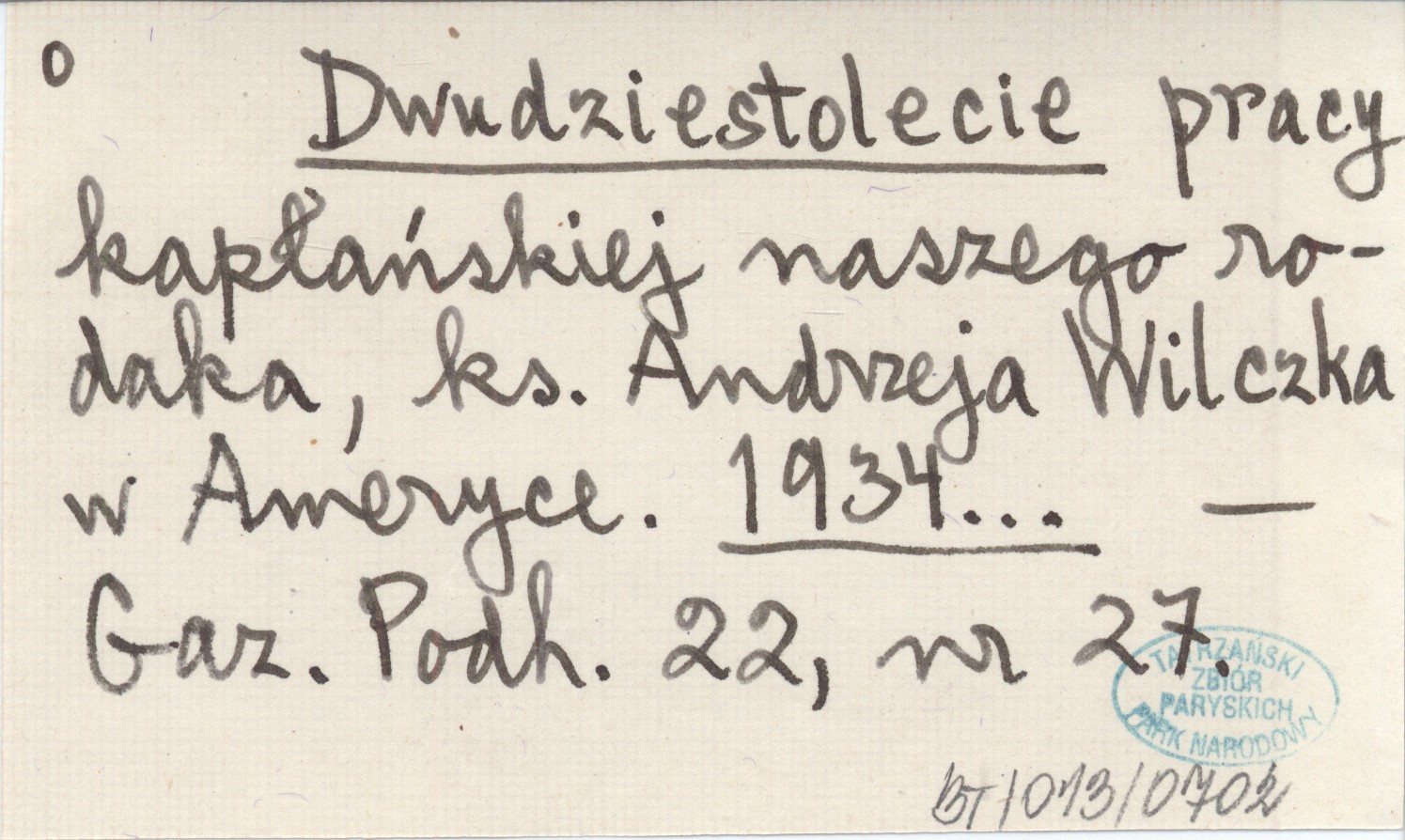 Dwudziestolecie pracy kapłańskiej naszego rodaka, ks. Andrzeja Wilczka w Ameryce. 1934...