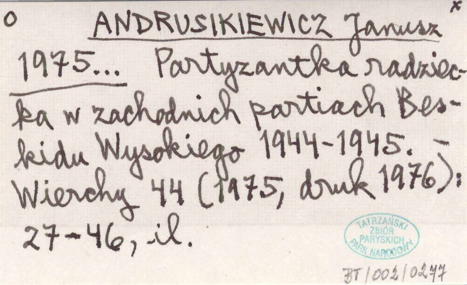 ANDRUSIKIEWICZ Janusz 1975... Partyzantka radziecka w zachodnich partiach Beskidu Wysokiego 1944 - 1945.