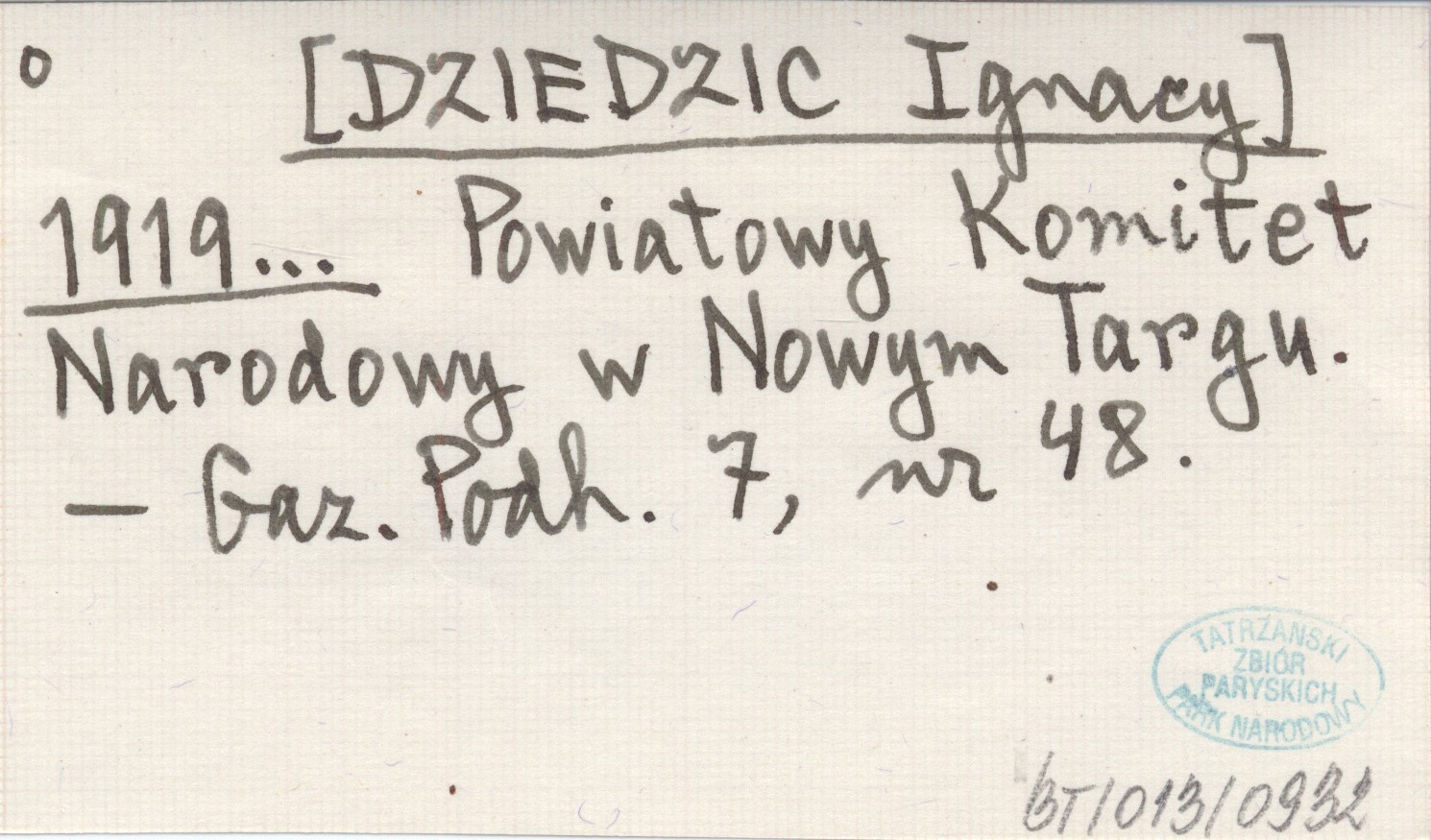 [DZIEDZIC Ignacy] 1919... Powiatowy Komitet Narodowy w Nowym Targu.