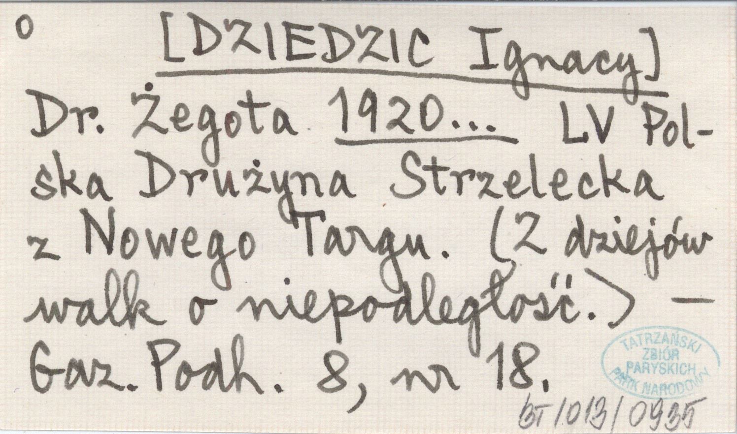 Dr. Żegota [DZIEDZIC Ignacy] 1920... LV Polska Drużyna Strzelecka z Nowego Targu. (Z dziejów walk o niepodległość).