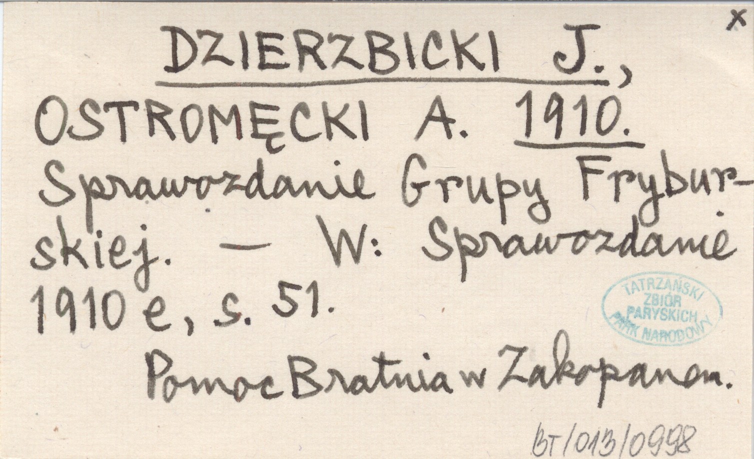 DZIERZBICKI J. OSTROMĘCKI, A. ; 1910 Sprawozdanie Grupy Fryburskiej.