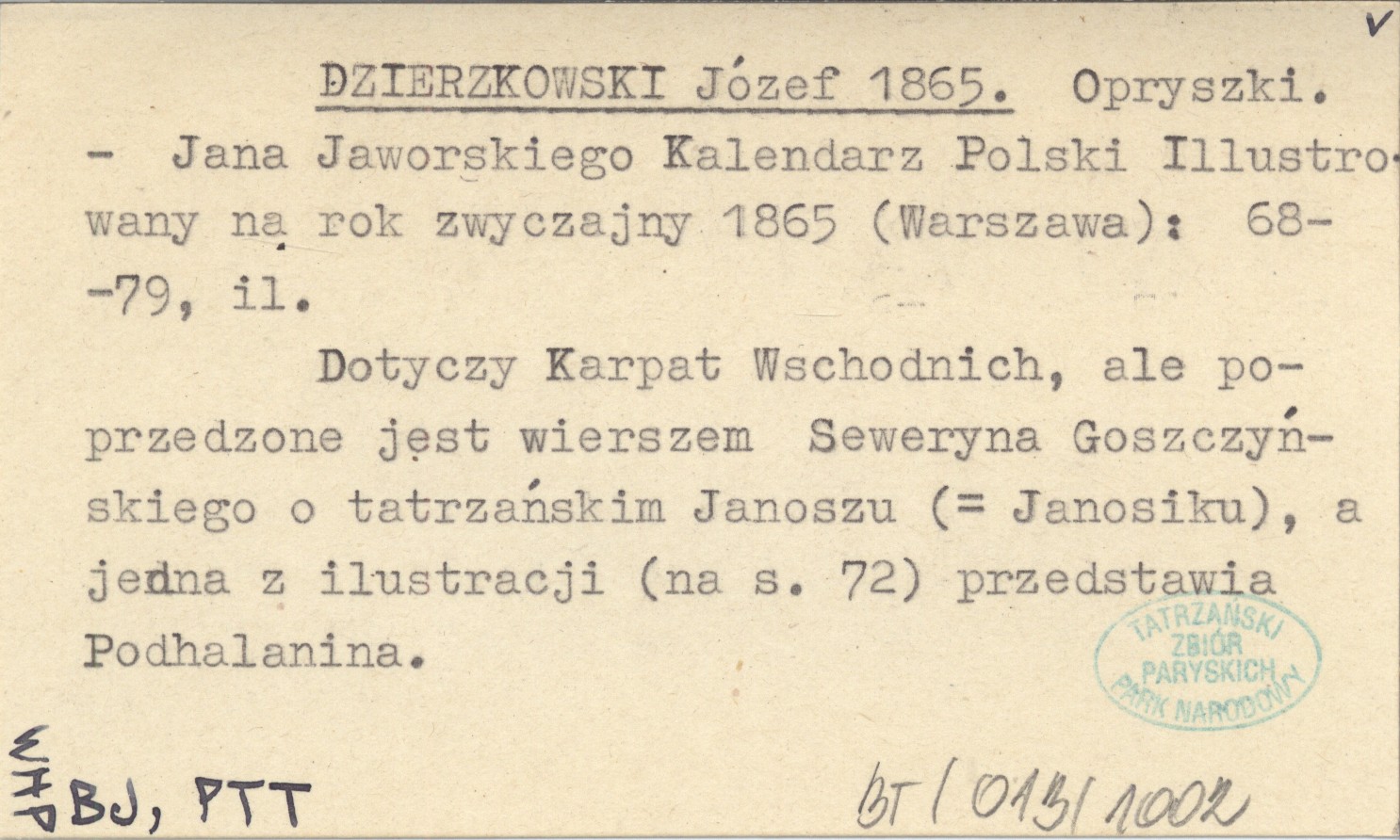 Jana Jaworskiego Kalendarz Polski Ilustrowany na rok zwyczajny 1865 (Warszawa) , S. 68-79, il. Dotyczy Karpat Wschodnich, ale poprzedzone jest wierszem Seweryna Goszczyńskiego o tatrzańskim Janoszu (=Janosiku), a jedna z ilustracji (na s. 72) przedstawia Podhalanina.