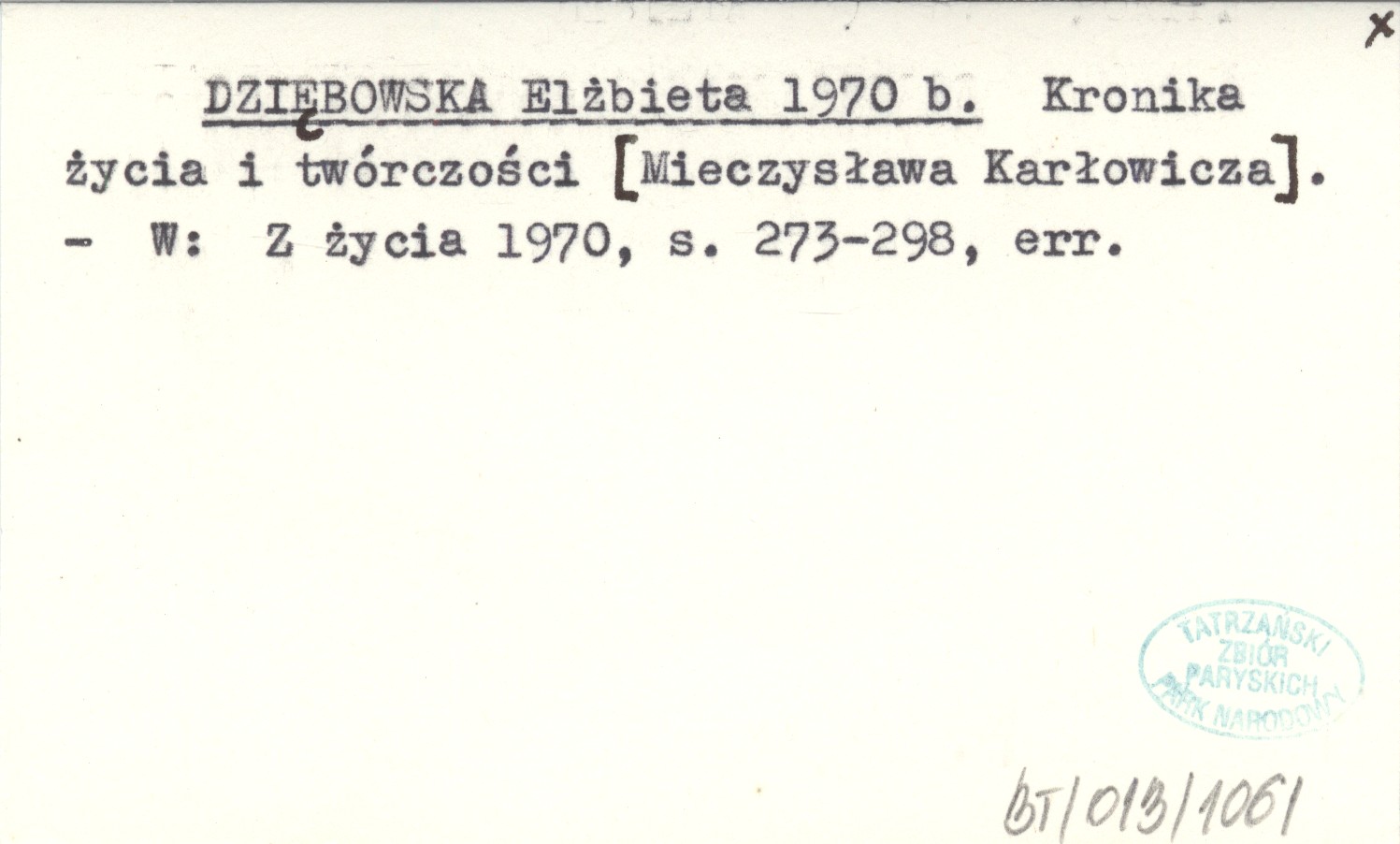 DZIĘBOWSKA Elżbieta 1970 b Kronika życia i twórczości [Mieczysława Karłowicza].