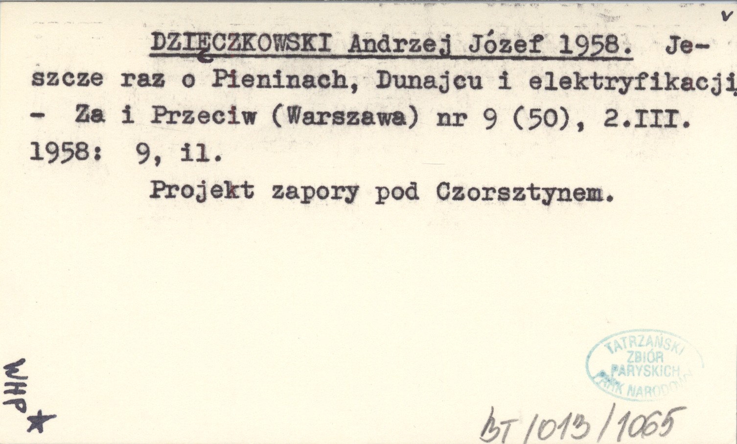 DZIĘCZKOWSKI Andrzej Józef 1958 Jeszcze raz o Pieninach, Dunajcu i elektryfikacji.