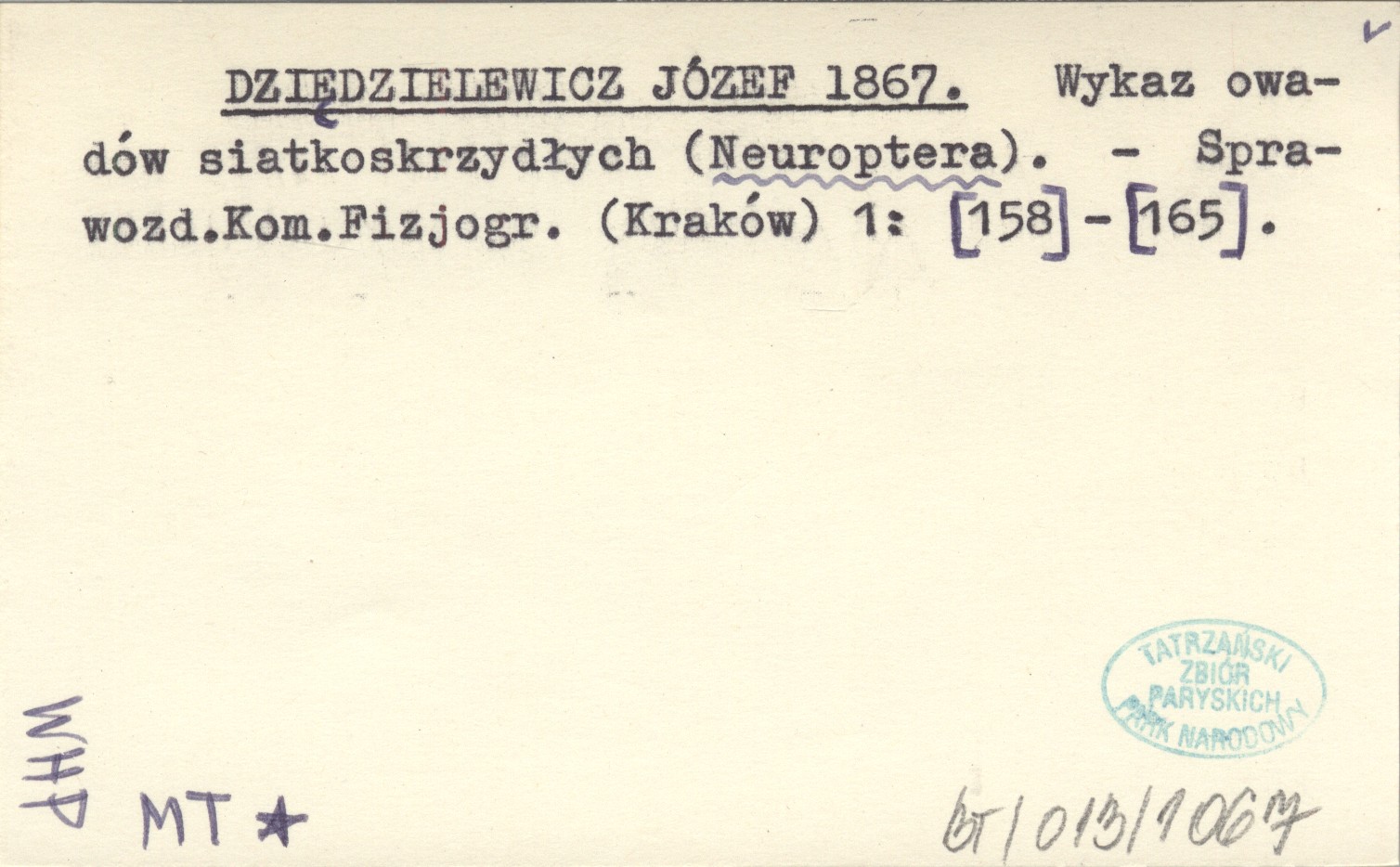 DZIĘDZIELEWICZ Józef 1867 Wykaz owadów siatkoskrzydłych (Neuroptera).