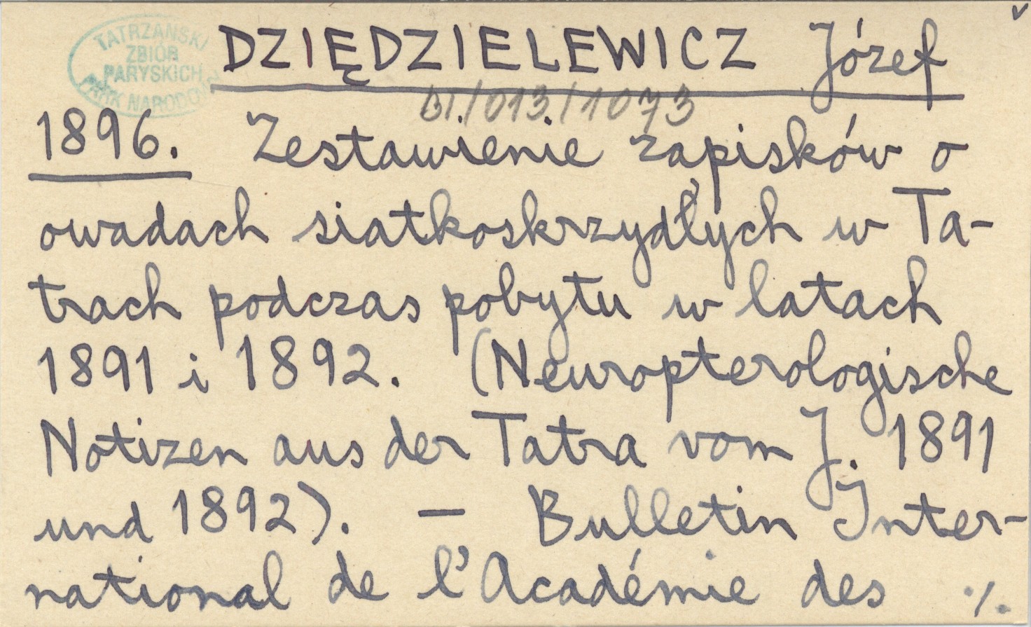 DZIĘDZIELEWICZ Józef 1896 Zestawienie zapisków o owadach siatkoskrzydłych w Tatrach podczas pobytu w latach 1891 i 1892. (Neuropterologische Notizen aus der Tatra vom J. 1891 und 1892).