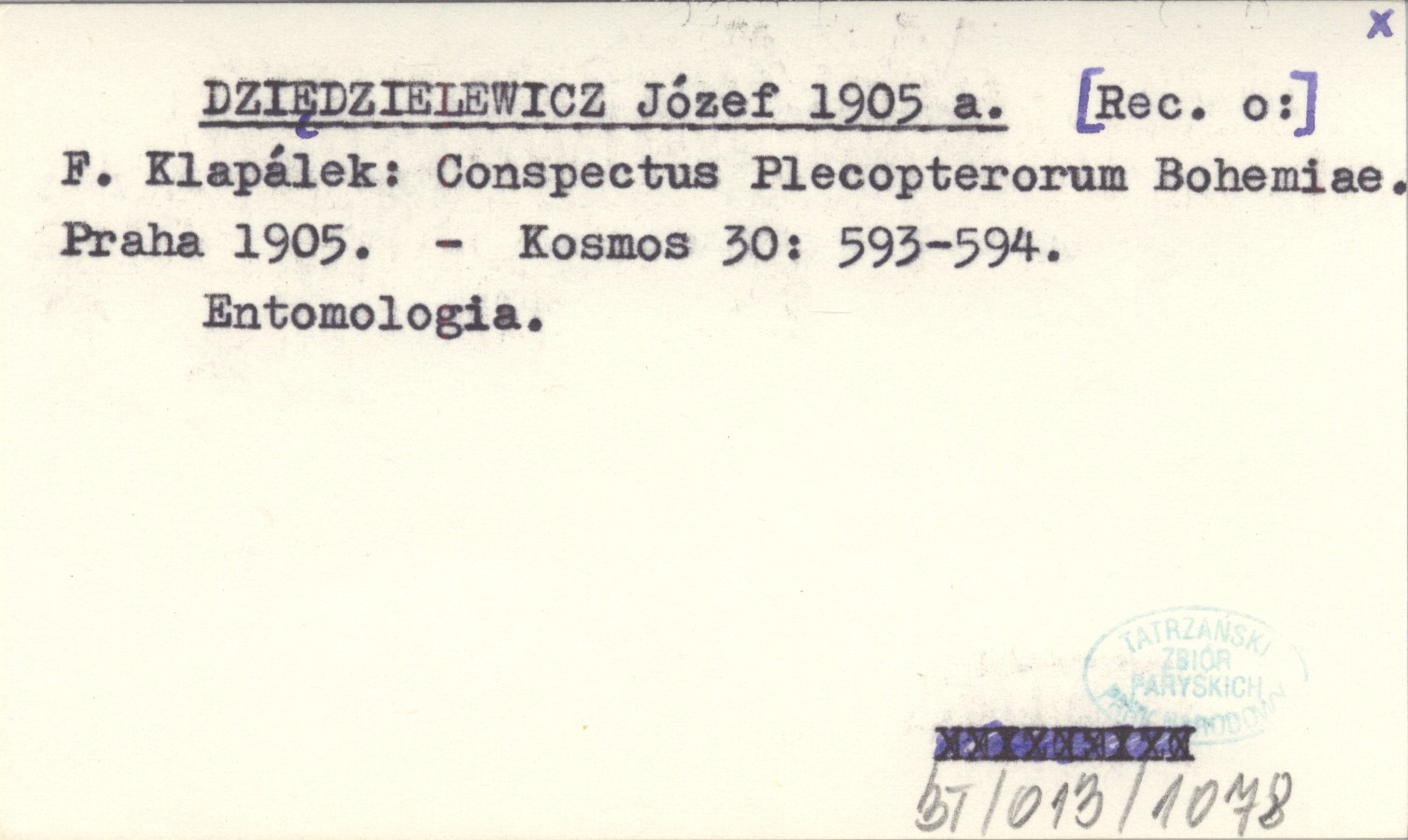 DZIĘDZIELEWICZ Józef 1905 a [Rec. o:] F. Klapálek: Conspectus Plecopterorum Bohemiae. Praha 1905.