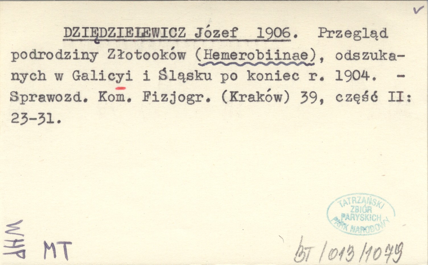 DZIĘDZIELEWICZ Józef 1906 Przegląd podrodziny Złotooków (Hemerobiinae), odszukanych w Galicyi i Śląsku po koniec r. 1904.