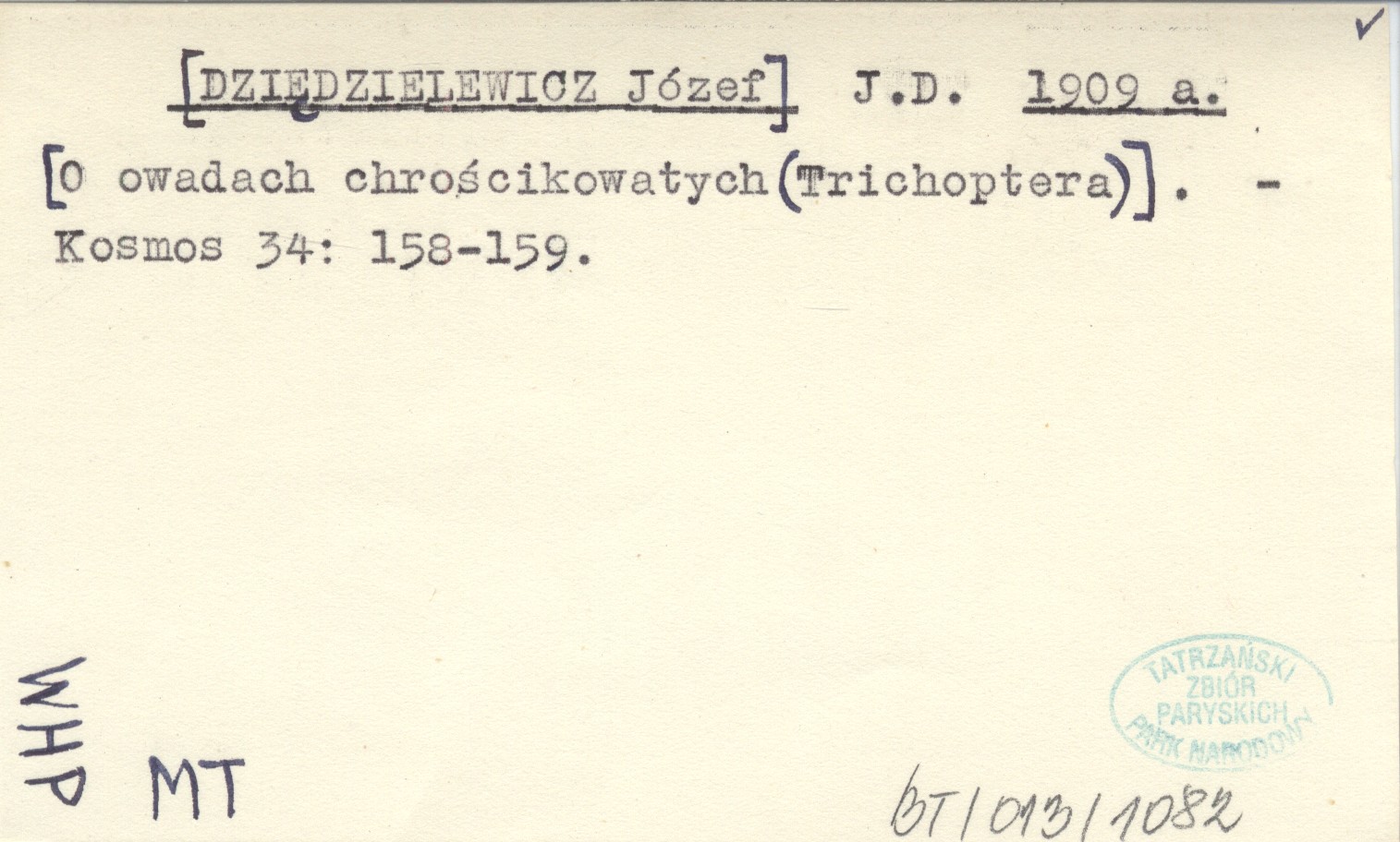 J. D. [DZIĘDZIELEWICZ Józef] 1909 a [O owadach chrościkowatych (Trichoptera).]