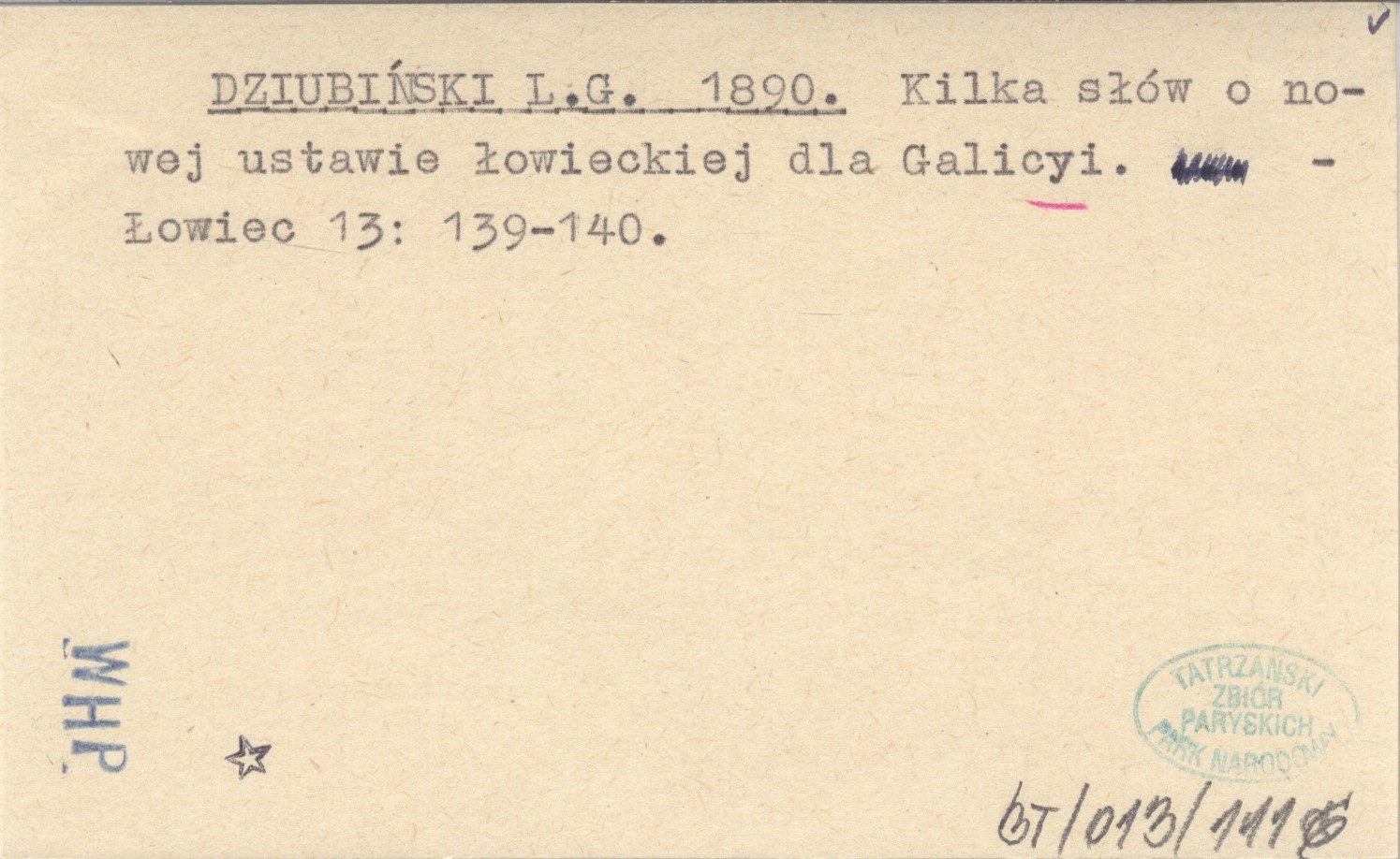 DZIUBIŃSKI L. G. 1890 Kilka słów o nowej ustawie łowieckiej dla Galicyi.