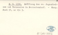 E. G. 1936 Eröffnung des ev. Jugendheimes und Turnsaales in Deutschendorf.