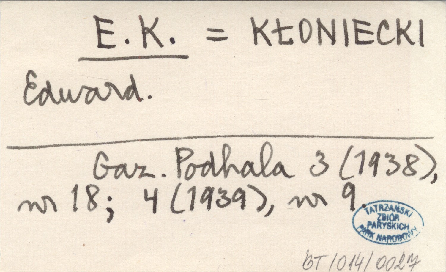 E. K. KŁONIECKI Edward Gazeta Podhala 3 (1938), nr 18 ; 4 (1939), nr 9.