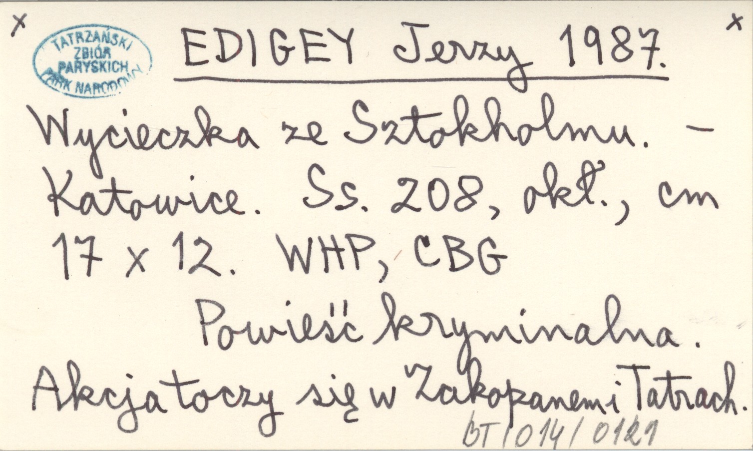 Katowice , 208 s., okł., 17x12 cm. Powieść kryminalna. Akcja toczy się w Zakopanem i Tatrach.